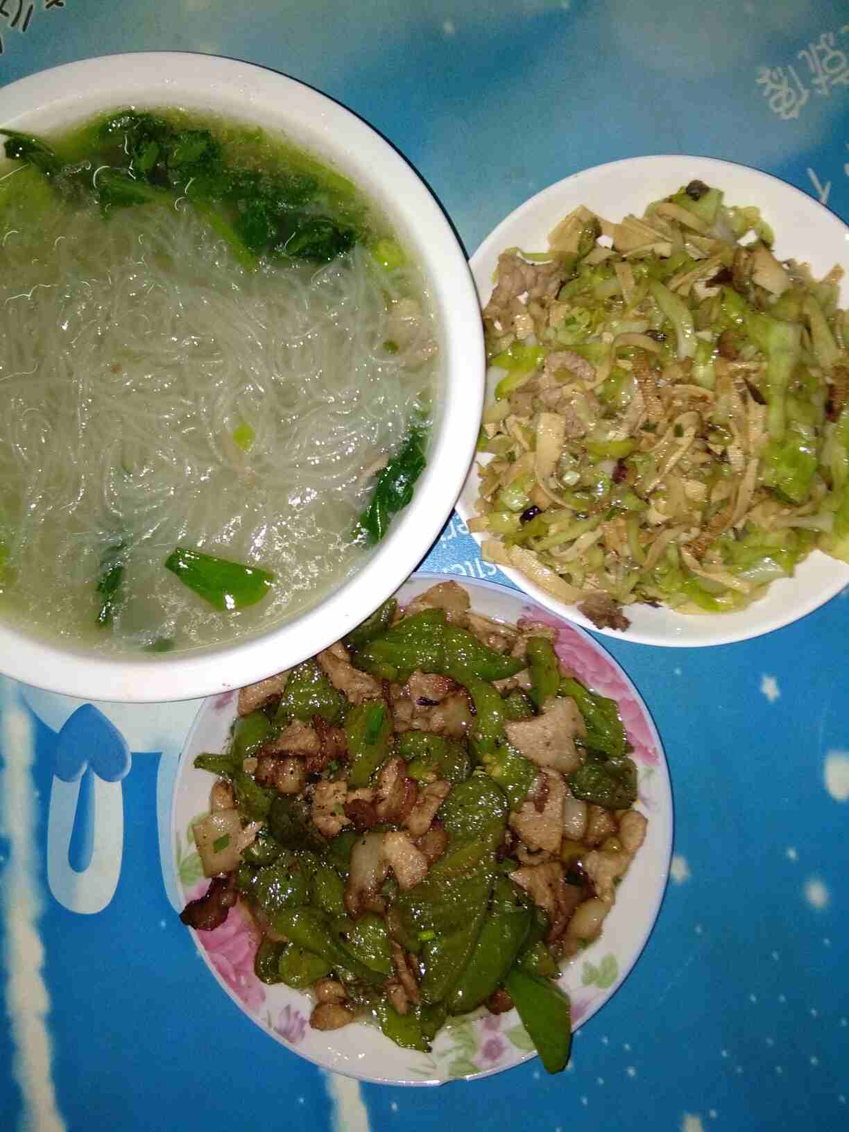 老妈烧的,青菜粉丝汤,青椒炒肉片,还有包菜百叶