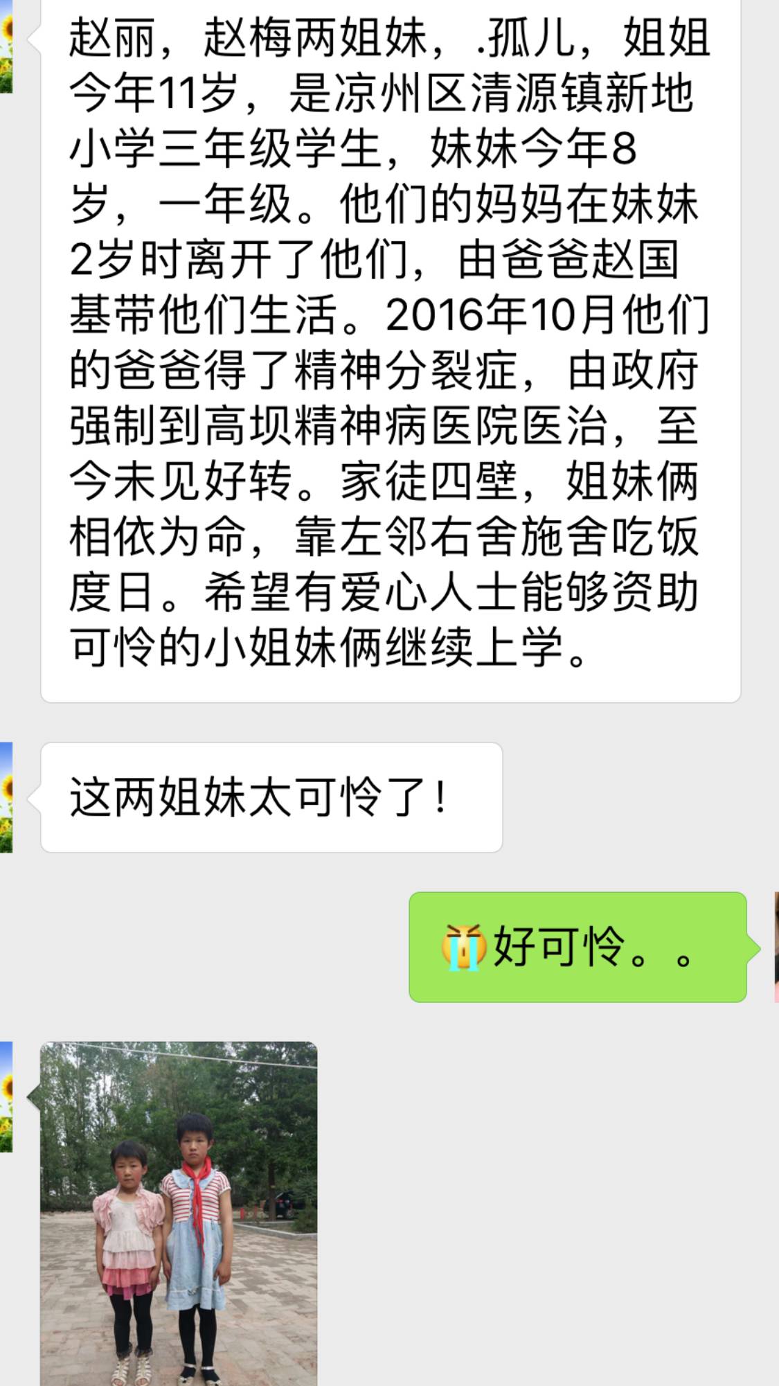 这两孩子一直是我的一块心病,母亲过世,父亲精神分裂已被强制收治。。。孩子彻底成了孤儿,找资助人已有一个月了,今天一位柴姓善心人回复,愿意以他过世儿子命名的基金会出面资助。。