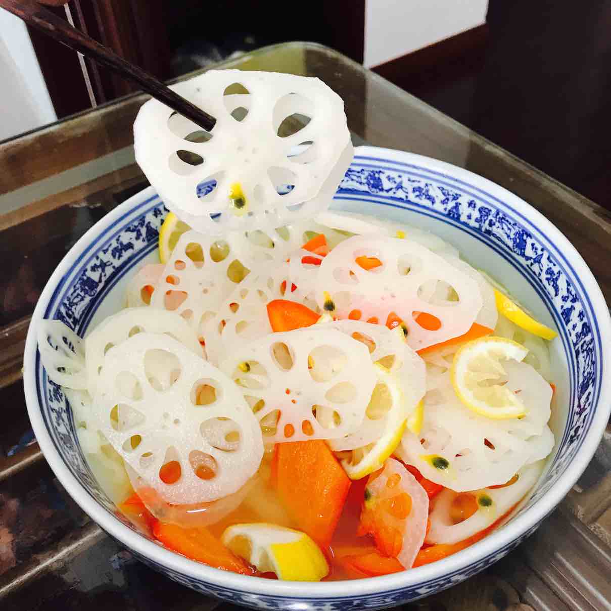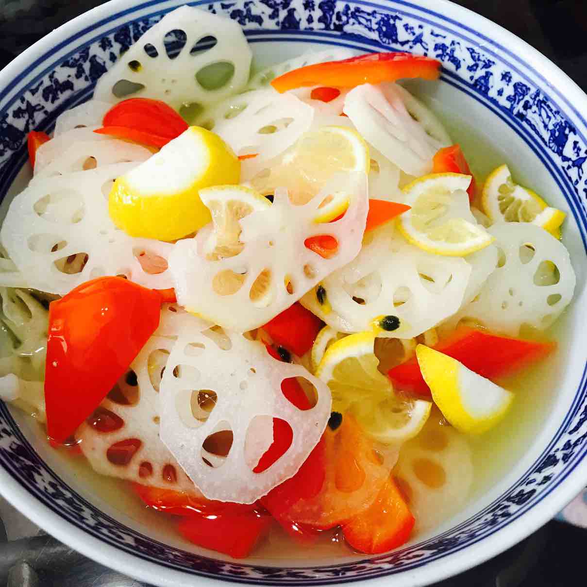 很简单的,就是藕片,彩椒柠檬都切好,放醋,糖,盐,百香果拌一下,稍微放点凉开水就