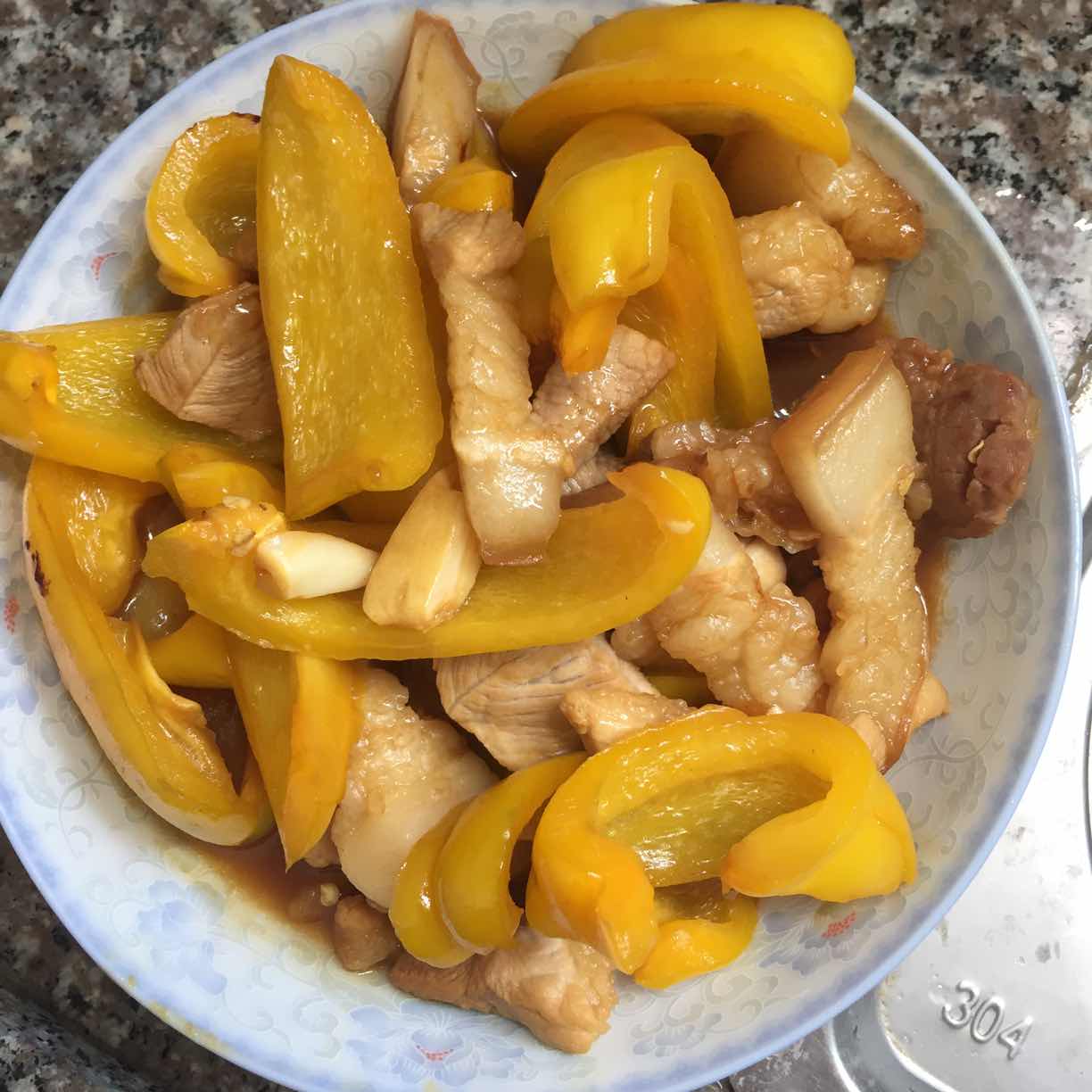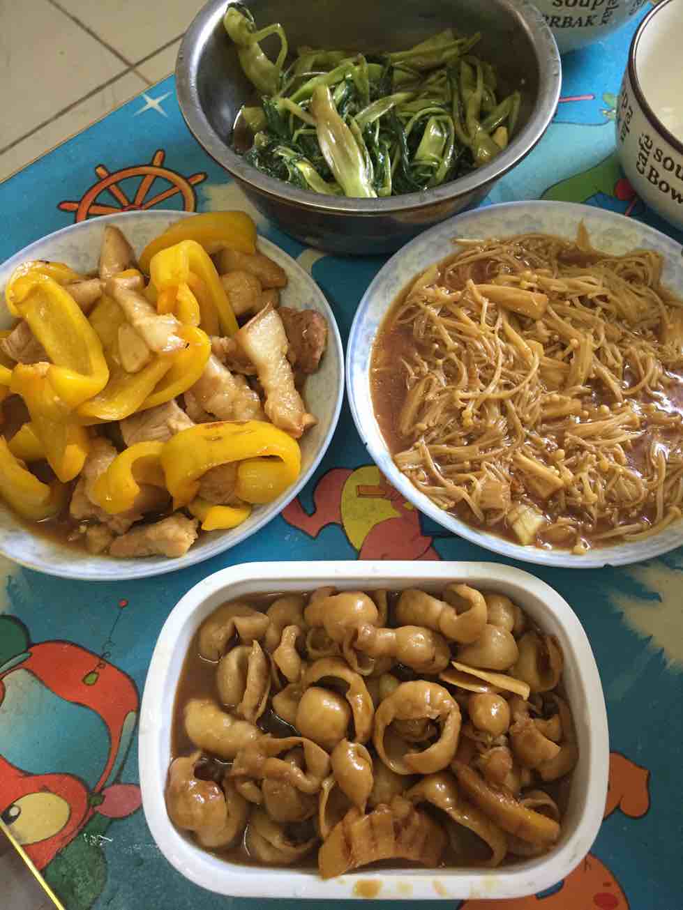 菜椒不该选黄的,切的大了。肥肠一大圈一大圈,看着不美啊。红烧太多,金针菇可以白烧。