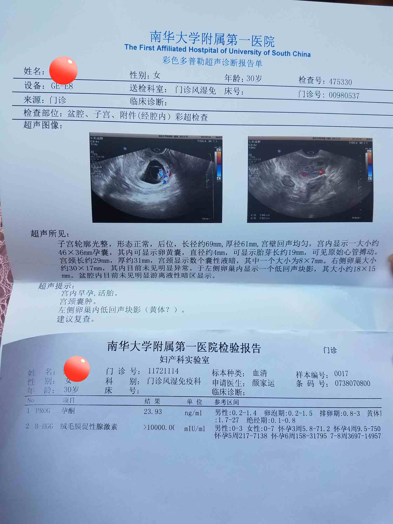 今天挂风湿科因为我们来得早是1号,所以老公叫风湿科医生顺便给我开了阴道b超和化验孕酮,hcg,刚好看妇产科的时候结果就有了,所以这样看医生又省了跑来跑去。