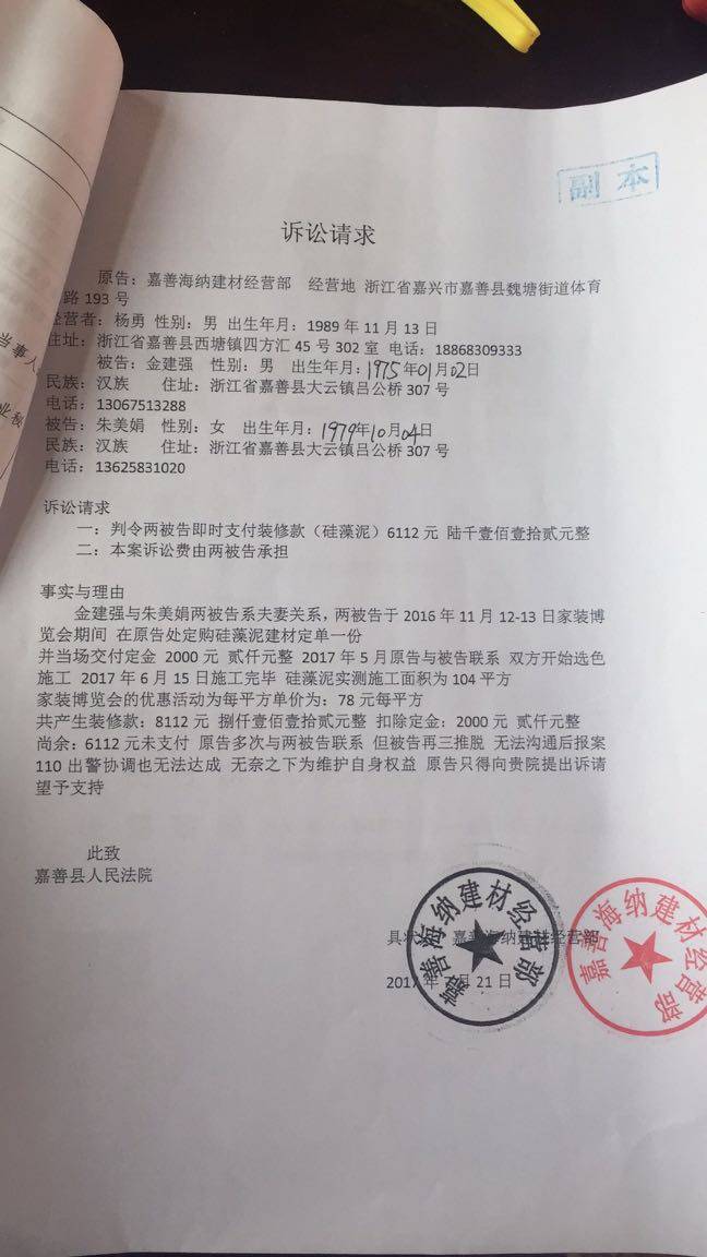 去年生病时家里在造房子还没装修,因为硅藻泥是洗吸甲醛的,想想自己生病了需要安全环保的材料,所以十一月份时在假装博览会是定了硅藻泥,付了两千定金,今年六月开始施工的,做了两次没做好,对方也承认做的不好,第三次返工时她们给我刷了大量乳胶漆,我不同意,但对方说做不好了,后来我经不起折腾也就算了!付尾款时对方跟我家老公起了争执,吵起来了,没动手,对方报了110,但110不管这事!今天我收到了法院的传票,对方起诉我付钱,我该怎么样维权呢?