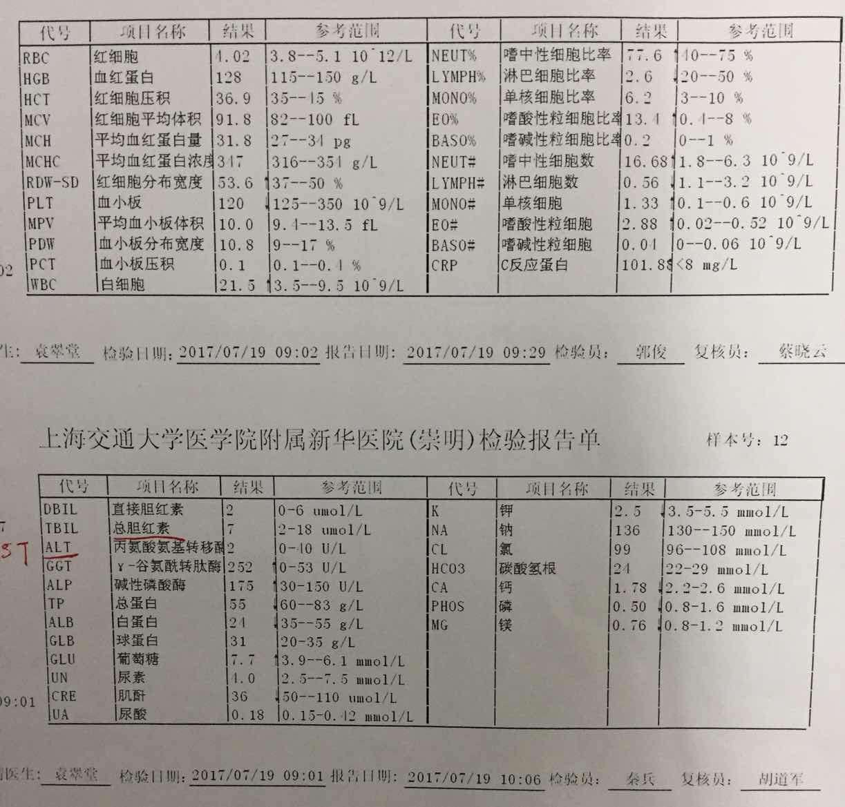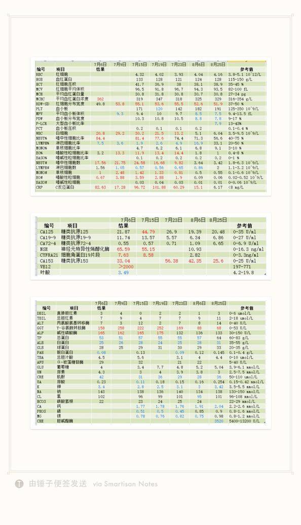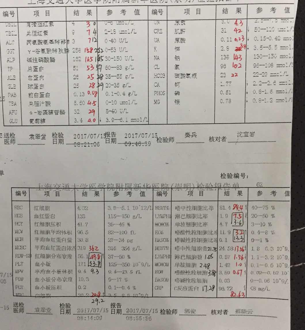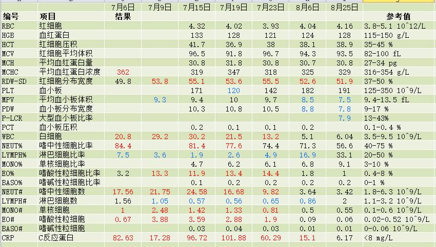 之前问您治疗方案的事,提供的资料不全,我又拍了些图。7月15日的常规血检图上,红水笔是7月6日的数值,黑水笔是7月9日的数值。