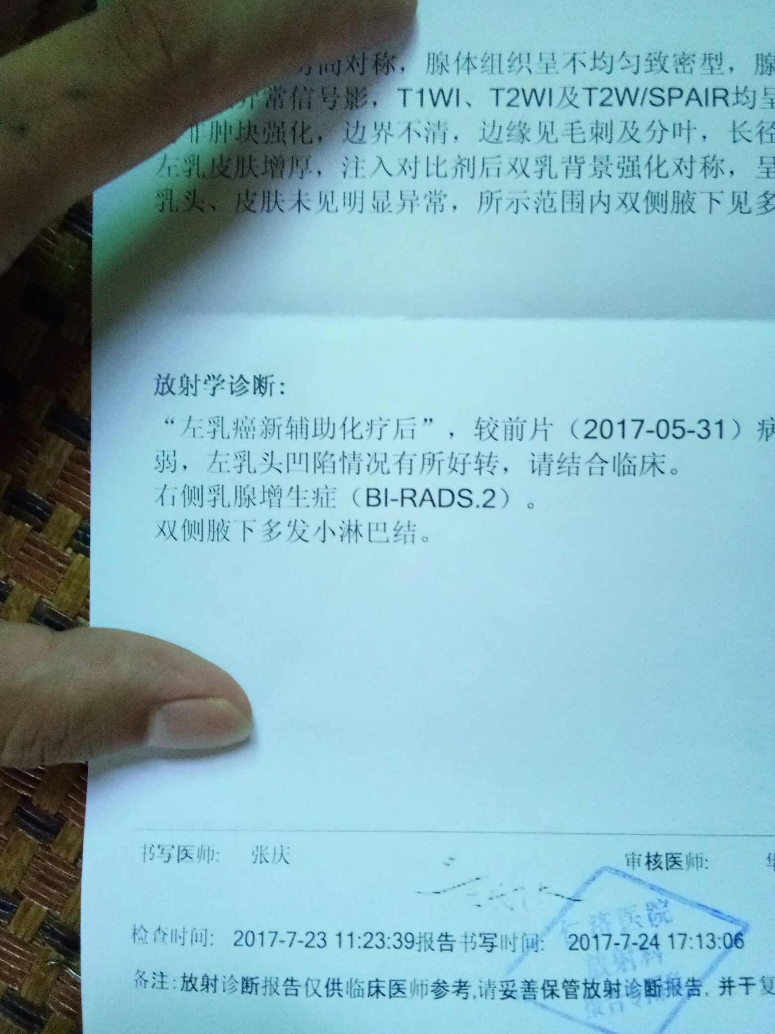 尊夫人这个检查结果主要要跟之前的进行对比,用来了解新辅助化疗的疗效,多发小淋巴结应该之前确诊时就有吧,至于是正常的还是转移的,如果做过淋巴结穿刺肯定有结论啊,如果没做过,那就看b超上对淋巴结描述,比如血流信号,淋巴门是否消失,如果是这样描述就是之前淋巴转移啊,你想搞清楚就去找主治医师问啊,你爱人应该是左侧局部皮肤及cooper韧带有侵犯,所以才会有乳头凹陷及局部皮肤增厚,不过化疗后有好转,说明药物还是明显有效果的,这些你都可以找医生咨询!