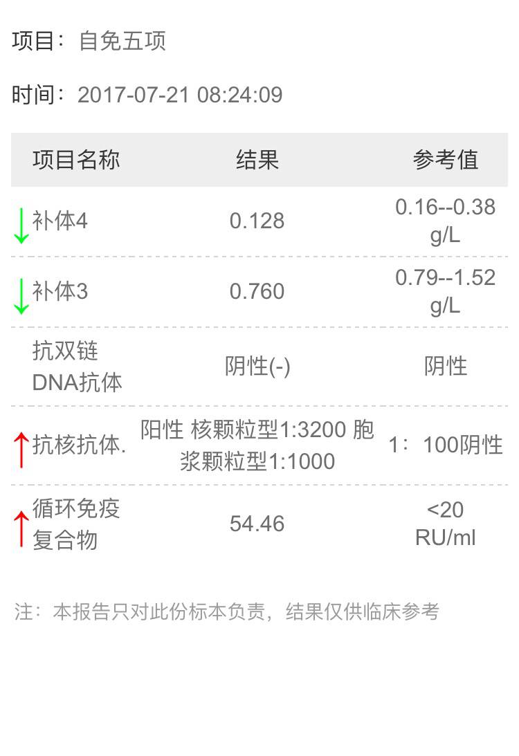 我看应该是稳定期啊。DNA和补体很重要,您的抗双链阴性,补体也没低多少没,血沉正常。我看是没啥事😊