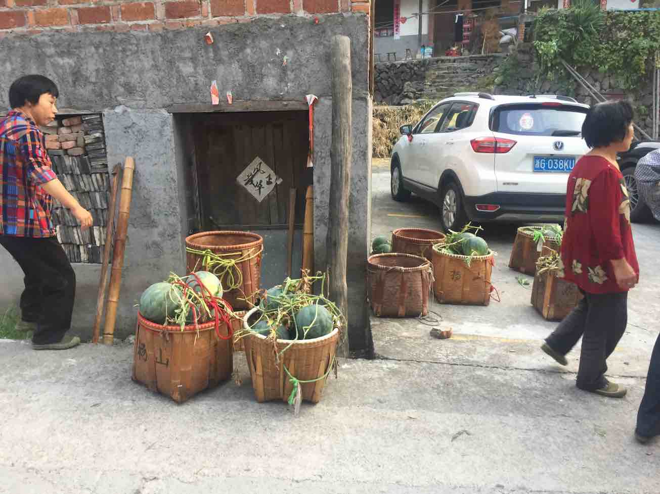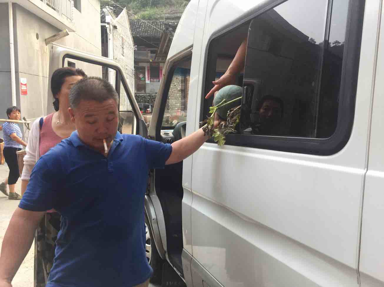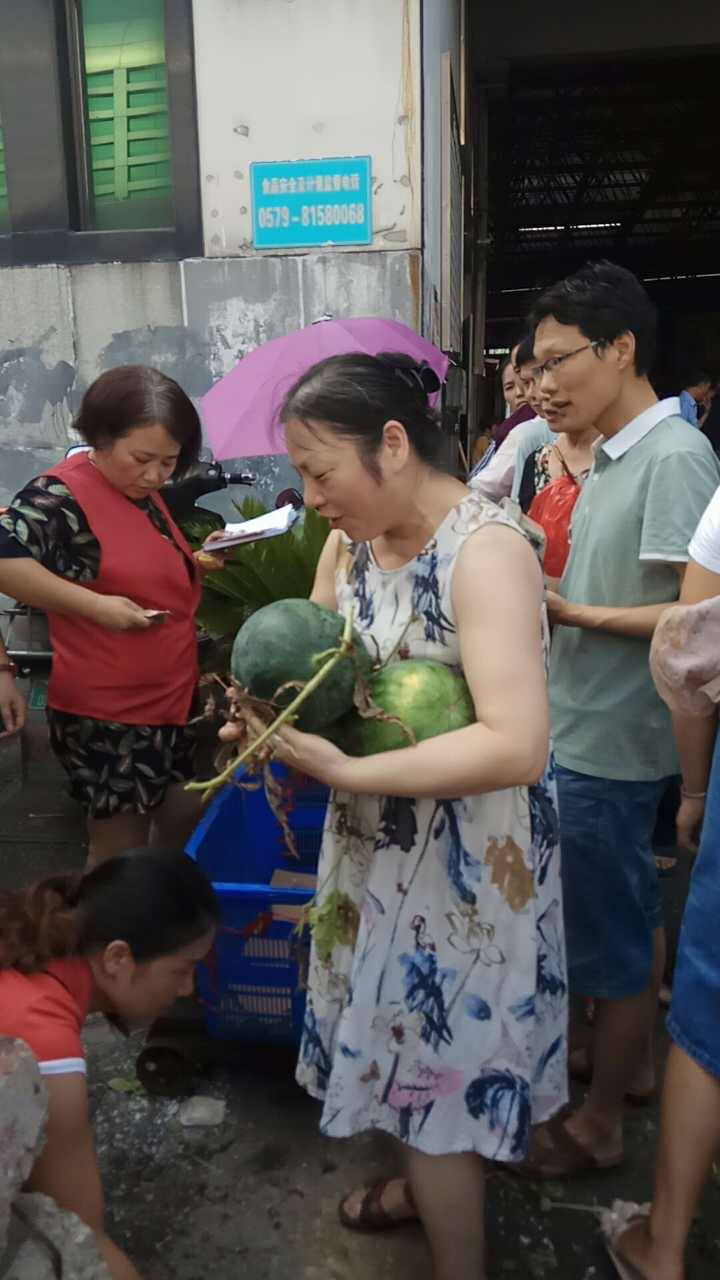 今天早上四点钟开始从山上挑西瓜下来,装了一吨半。到义乌八点半,九点多就被抢购一空。。
