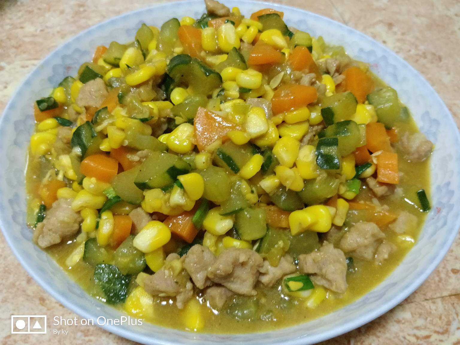 第四,当肉炒变色后,把黄瓜,玉米,胡萝卜一起到下去,然后加盐,胡椒粉,白糖,烧酒,再加水到平面,盖镬。