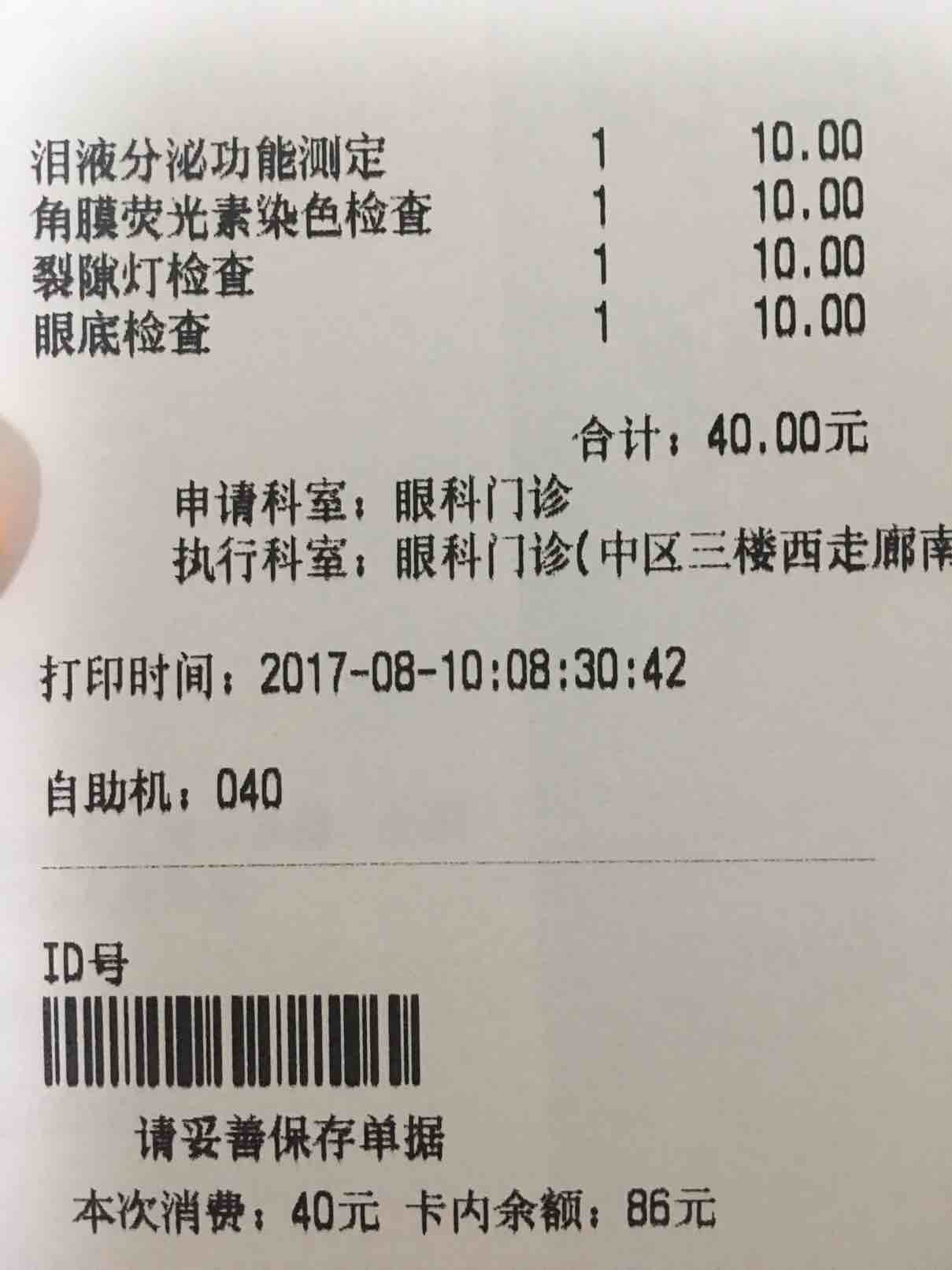 最近眼睛不舒服,吃纷乐正好半年,借着复查去眼科做了检查,告诉大夫吃纷乐,给我开了以下检查,主要看眼底和是不是干眼症,发上来给大家做个参考。我的眼底正常,其它有一项正常是10秒,我的是4秒,但算不上干眼症。