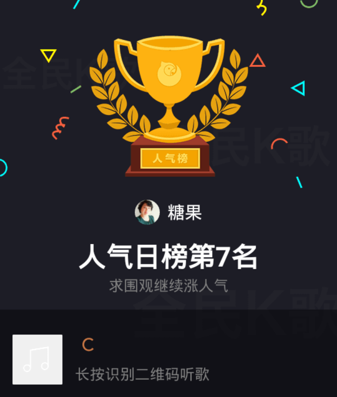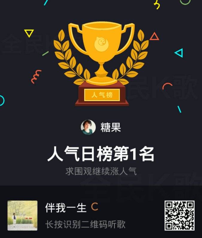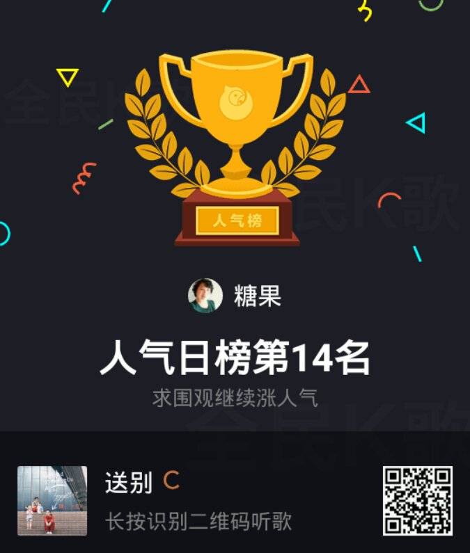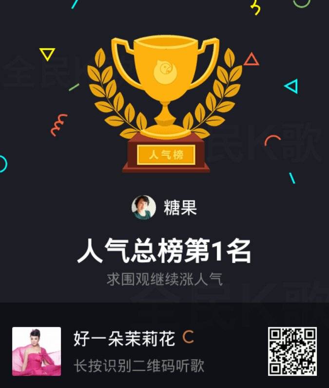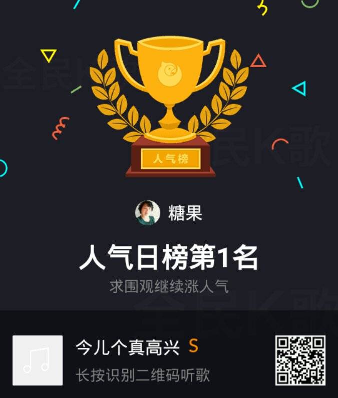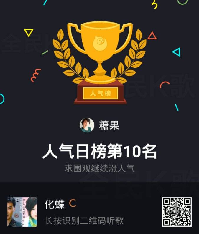 姐妹们大家好!前天我复查一切顺利!又看到我晒家乡获奖了,真高兴!所以在全民k歌里面唱了一首(今儿真高兴)庆祝一下!没想到还成为擂主!今天又在全国排名榜上获得人气奖第一名!真是高兴!也把喜悦分享给大家!祝姐妹们天天高兴!快乐永远!