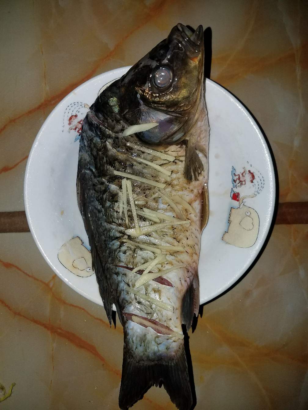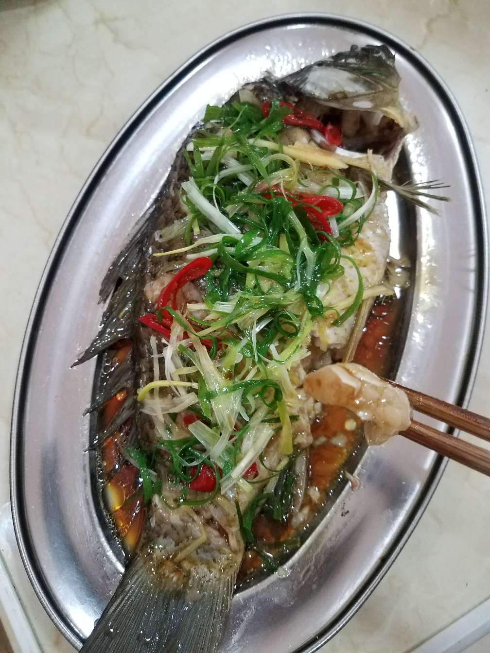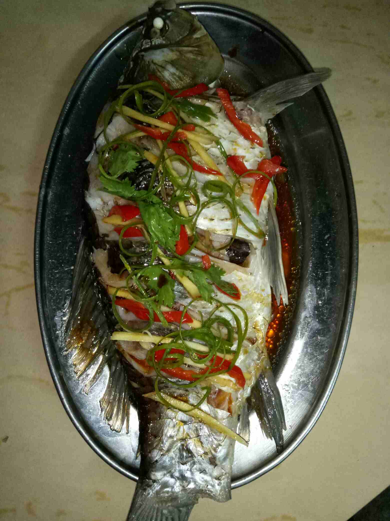 5:出锅后,倒掉鱼盘子里面的汁水,还有弄丢姜葱,换上之前备好的姜丝(各人爱好,我还放了一点不辣的辣椒)
