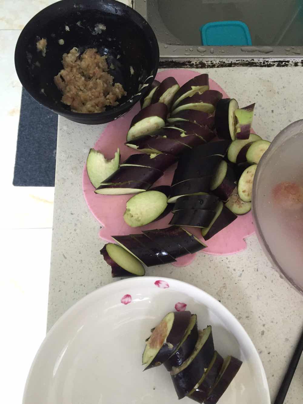 1、茄子洗净切片,每2片直接加肉末蒜末少许(肉末蒜末加少许盐拌匀),摆盘好后淋生抽,煮饭时直接放饭锅蒸,饭好后茄子直接淋熟油就能吃了,简单健康。