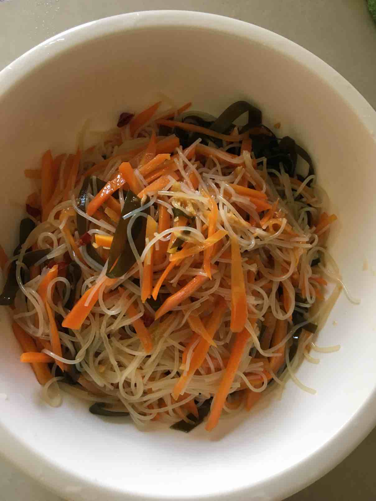 1.干的海带和粉丝泡软,胡萝卜切丝,然后放锅中焯水捞出,用凉开水浸一下。