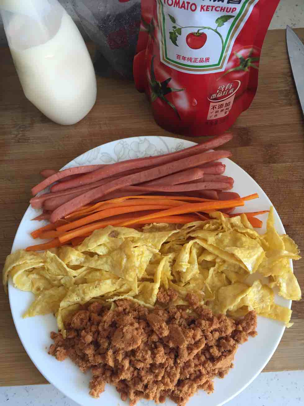 1、普通大米加糯米适量煮熟,超市买的紫菜片,准备火腿肠、胡萝卜、鸡蛋摊饼都切条,肉松,我的食材基本都超市买的。