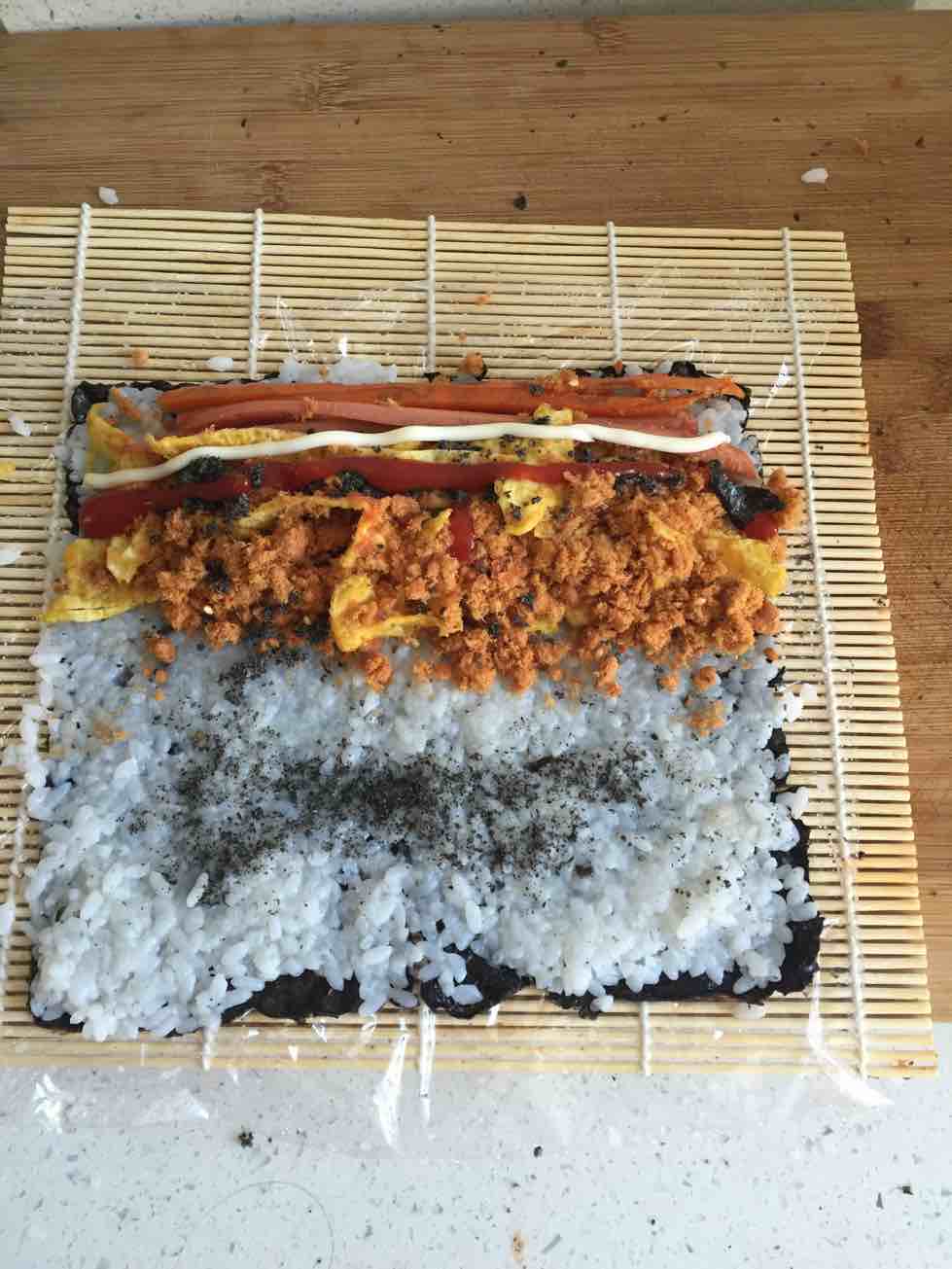 2、买紫菜会赠送卷珠帘子,平铺卷帘,保鲜膜(铺保鲜膜就不会粘,也干净)紫菜,米饭(米饭煮熟后加寿司醋,我淘宝上买的,哈哈,跟米饭拌匀,放凉)火腿胡萝卜鸡蛋肉松,番茄酱沙拉酱。