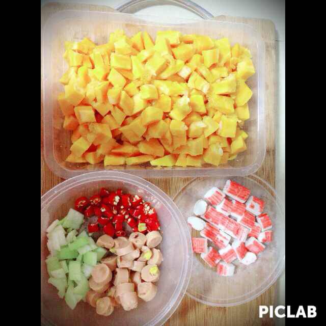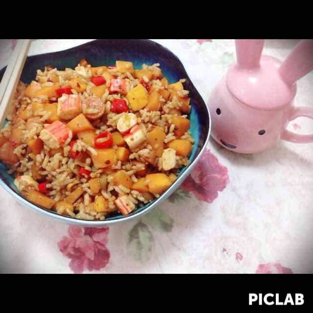 炒米饭:南瓜、火腿、小葱、蟹柳、红椒圈、大米、橄榄油