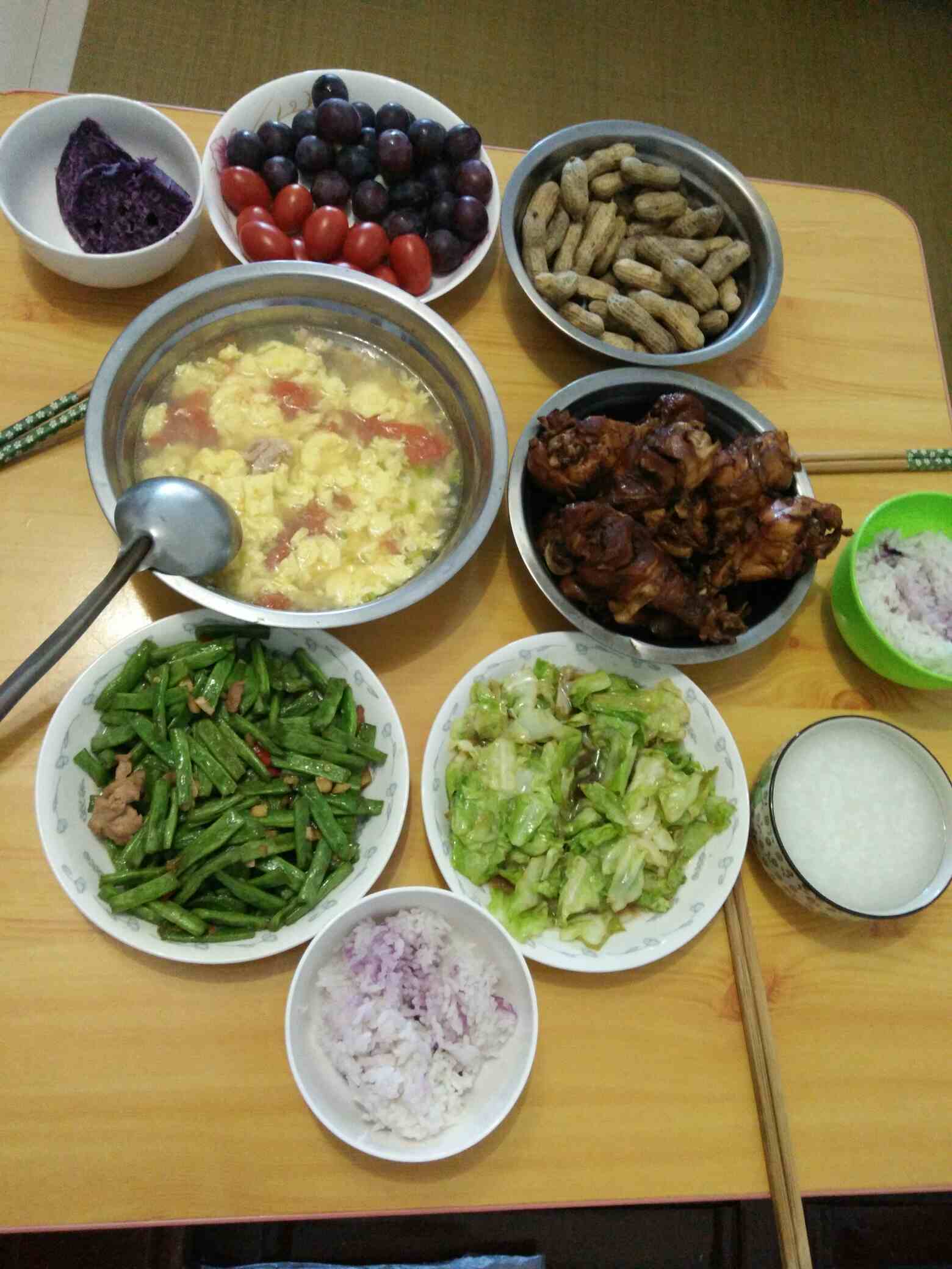 四季豆 包菜 红烧鸡腿 西红柿鸡蛋汤