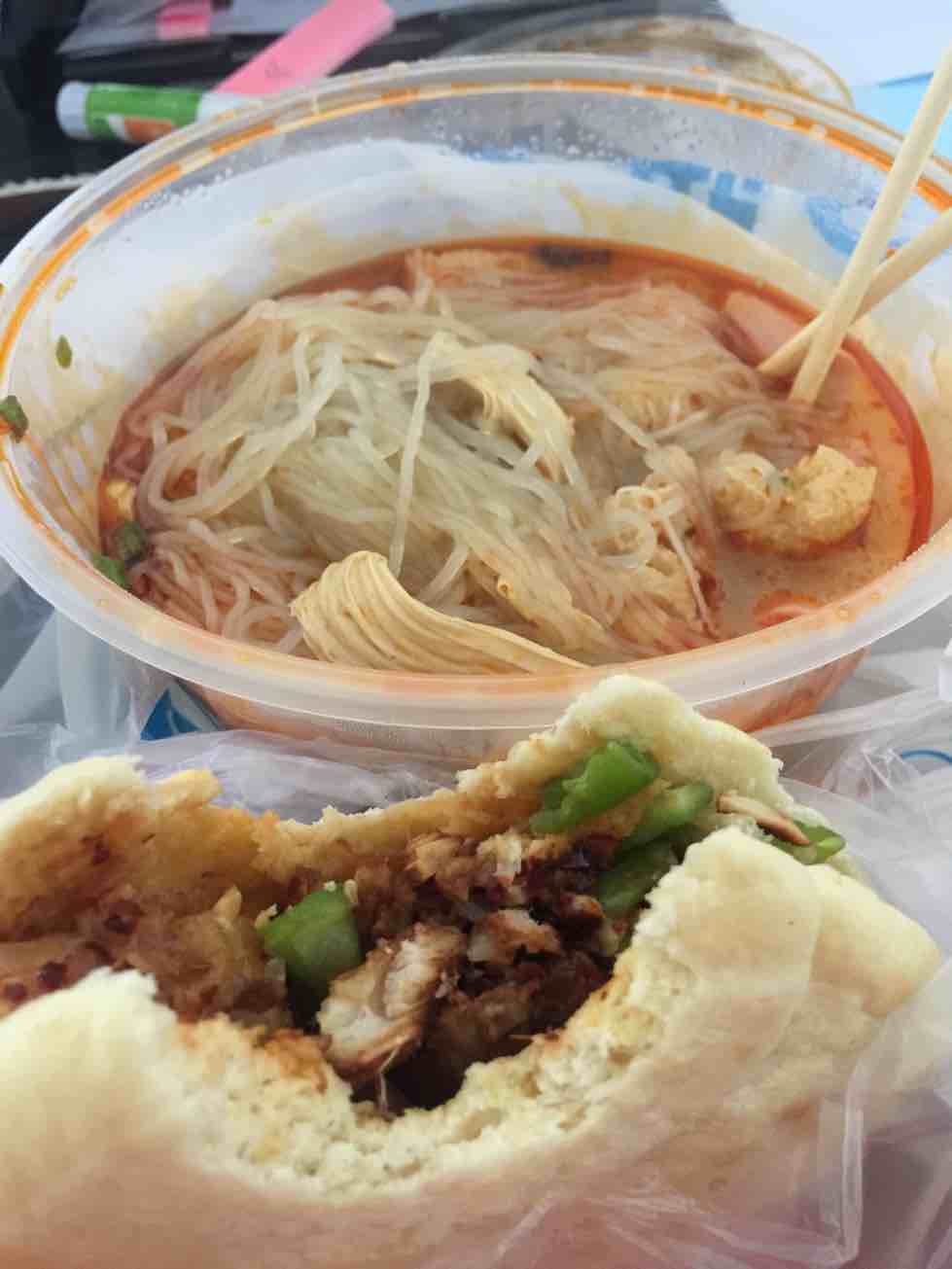 他临时要去干活,饭都没来得及吃,我一个人,无聊吃麻辣烫配肉夹馍。。。