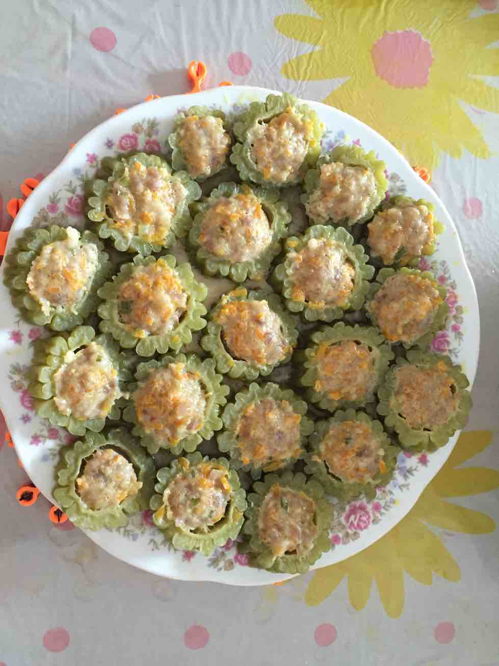2、一根苦瓜,切小段,用小勺取瓤,把拌好的肉放苦瓜中间,摆好上蒸锅,我是直接煮饭放饭锅上蒸,这样饭好菜也好了,很省事。