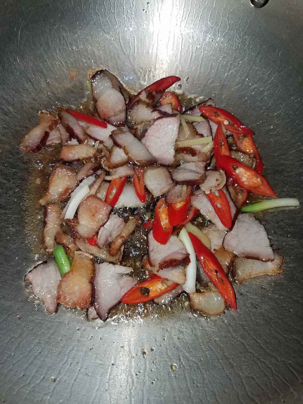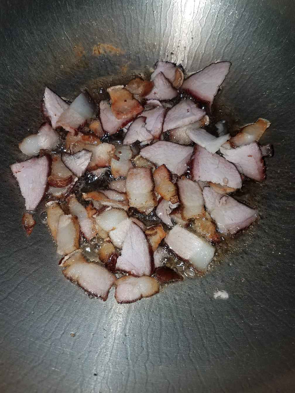 4:热锅,先倒肥带皮的腊肉下去,先煎炒一下出油,然后再倒瘦的腊肉下去。