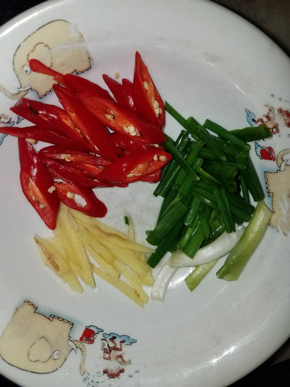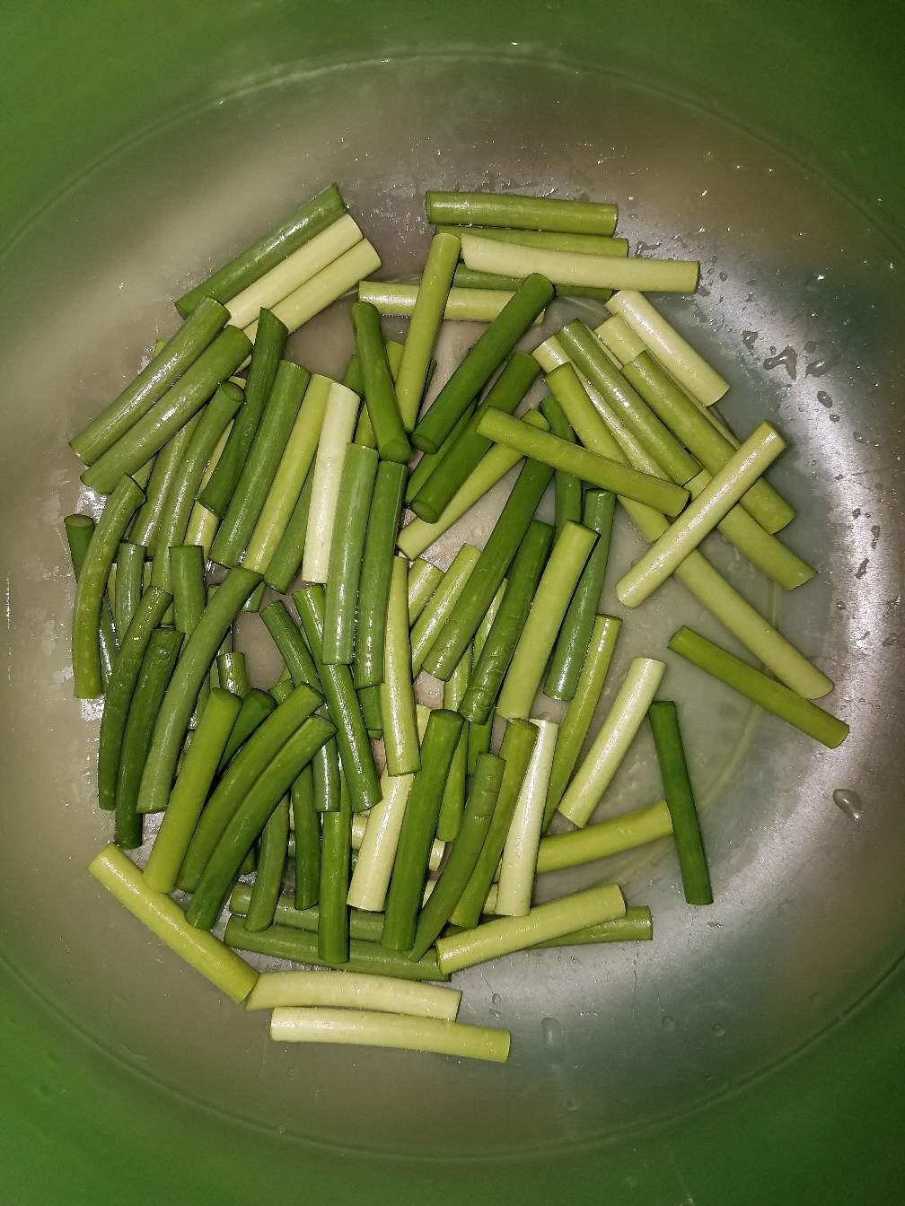 3:蒜苔洗干净切段,还有姜切丝,葱切段,辣椒(不辣的)切好备用!