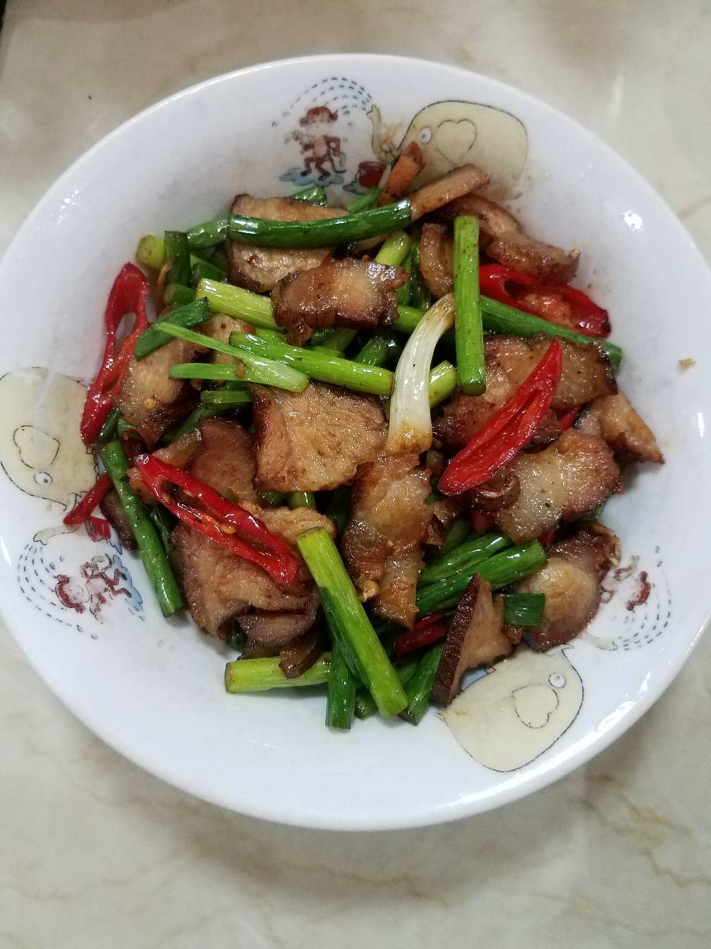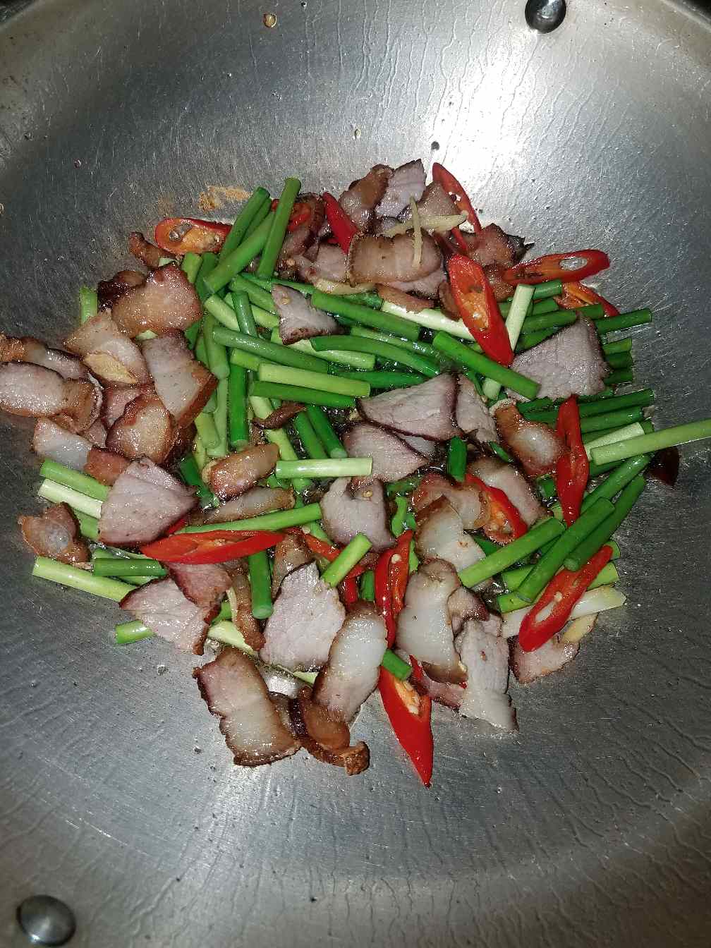 今天做的主菜是:腊肉炒蒜苔