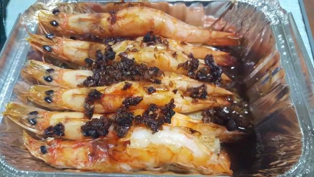 普通海虾,剪去虾枪虾须去砂囊虾线。切蒜蓉加盐小活煸熟,最后放点蒸鱼豉油。烤盒里面铺上金针菇,虾在上面排队,把刚炒的蒜蓉豉汁盖虾上面,烤箱180度,25分钟左右,ok。
