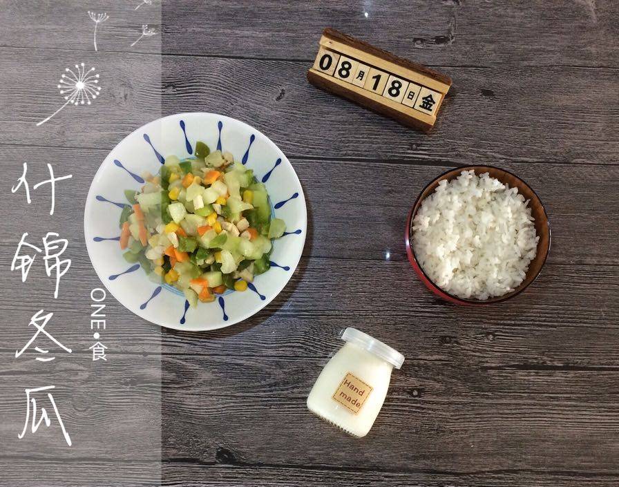 冬瓜,胡萝卜、青椒、鸡胸切丁备用,玉米是罐头的玉米粒;先下鸡肉炒至变色,再下胡萝卜翻炒至变橘色再下冬瓜玉米粒和青椒,加些盐,炒到冬瓜变半透明时,放鸡粉和香油拌匀出锅。
