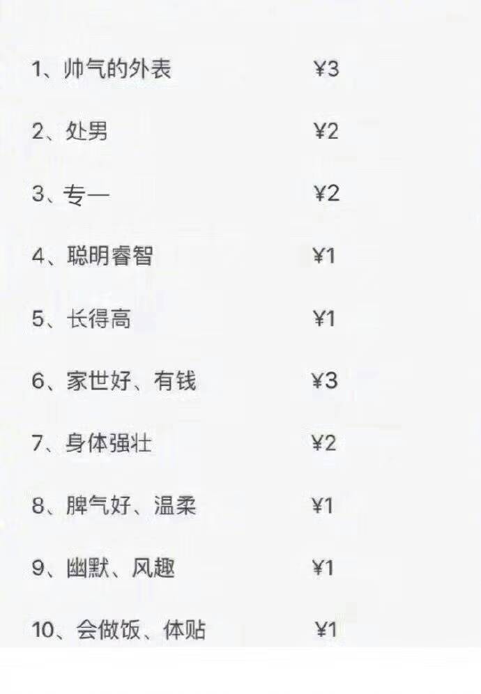 我觉的8 9 10=3元,足够了,一般来说幽默风趣的人都聪明睿智,聪明睿智的可以不用置疑他赚钱的能力,从而也不用考虑他的家底,真体贴的也都专一(假体贴不叫体贴),至于帅气,王八瞅绿豆,对眼了怎么看都帅气