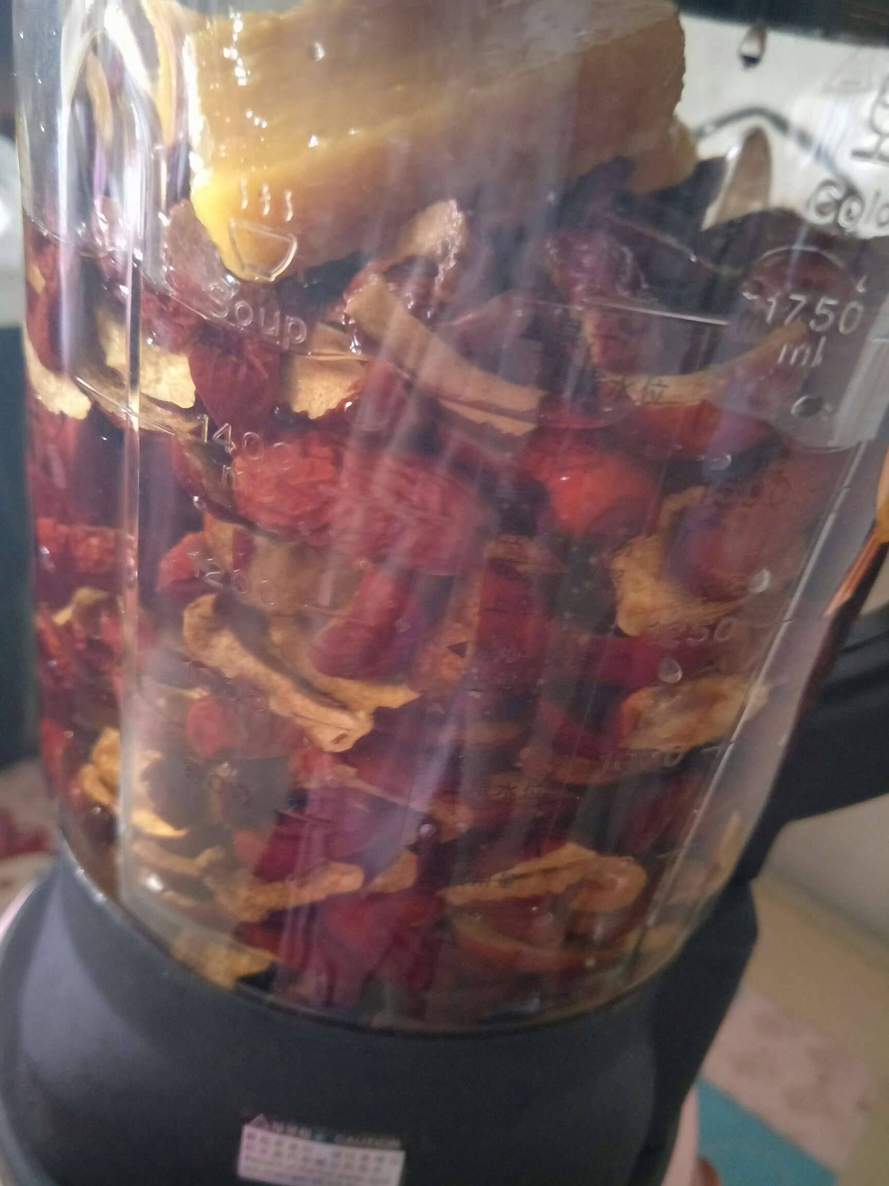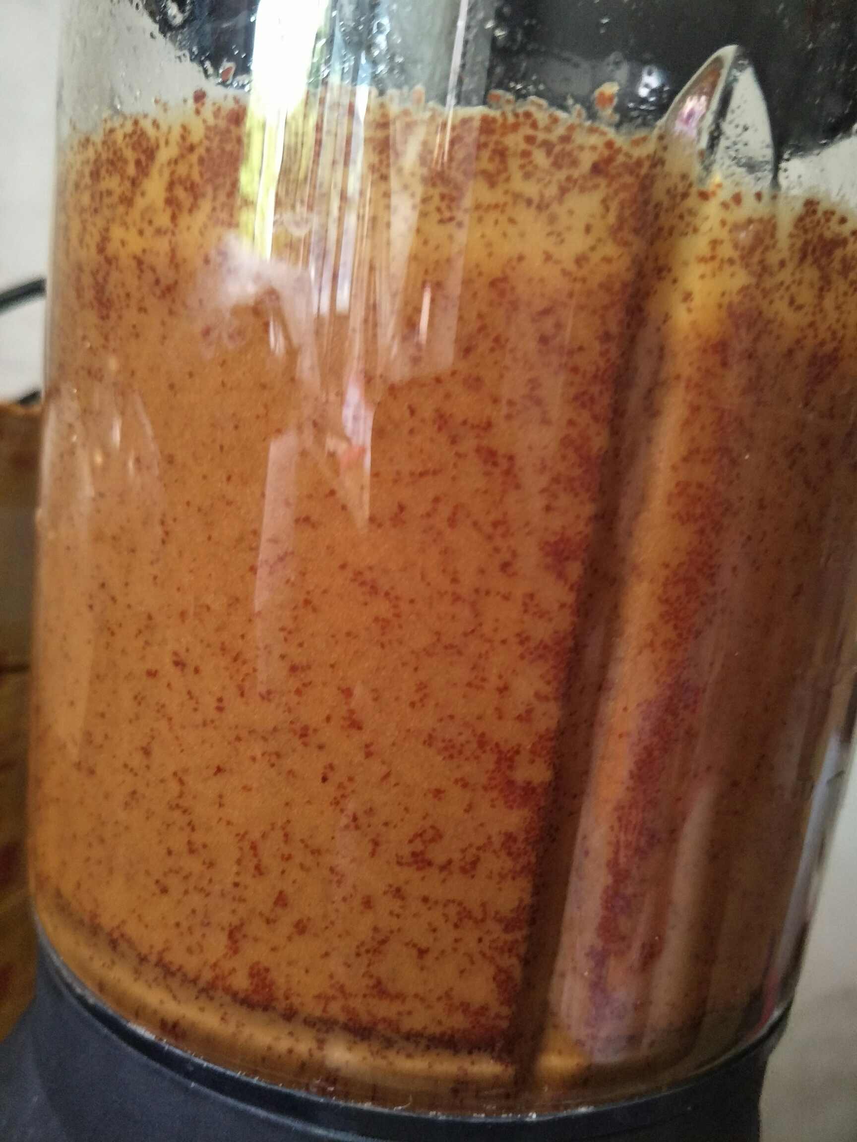 6.把红枣浆倒出来盘子里,再将马蹄粉浆倒入红枣浆里面,搅拌均匀!