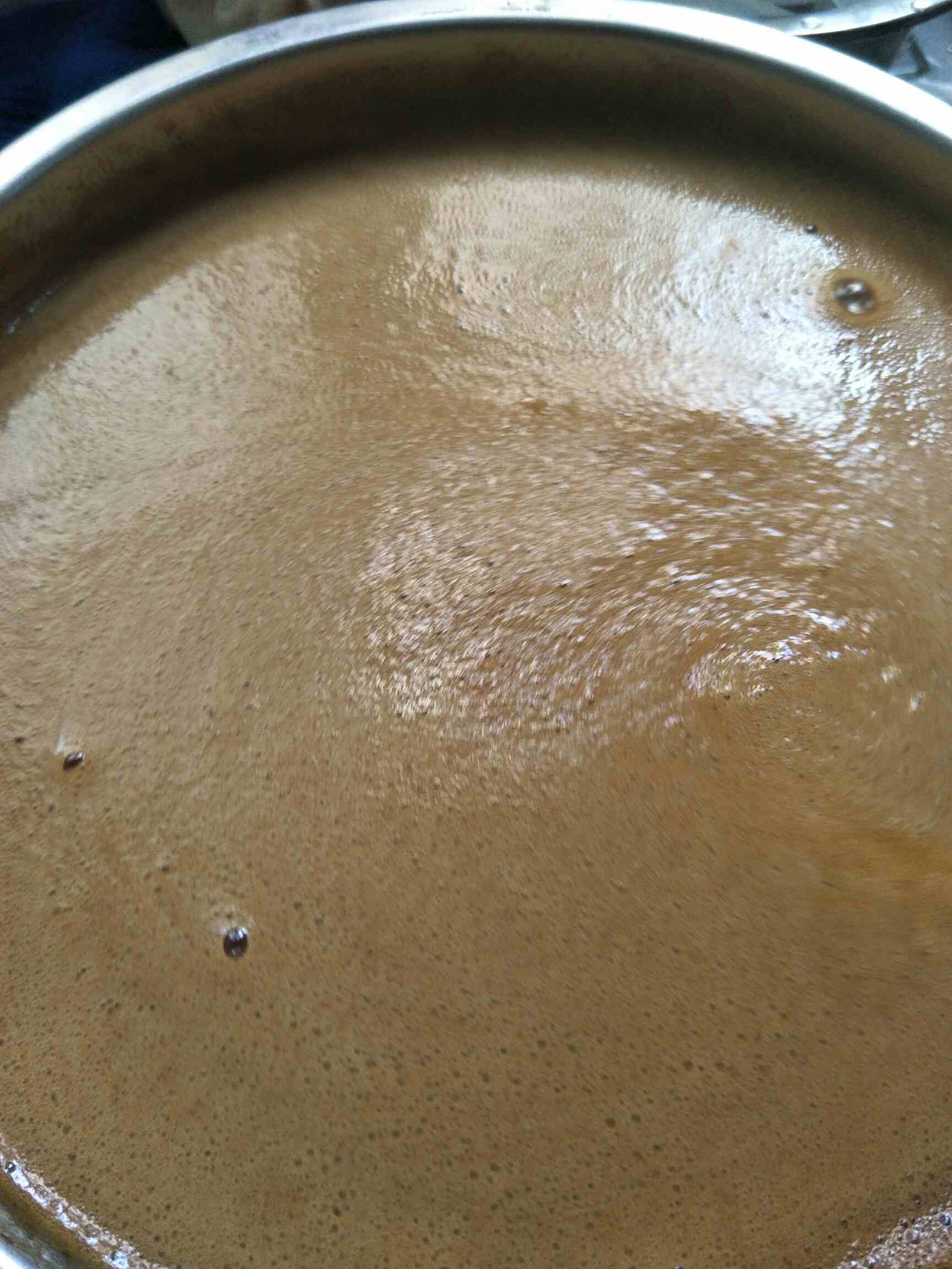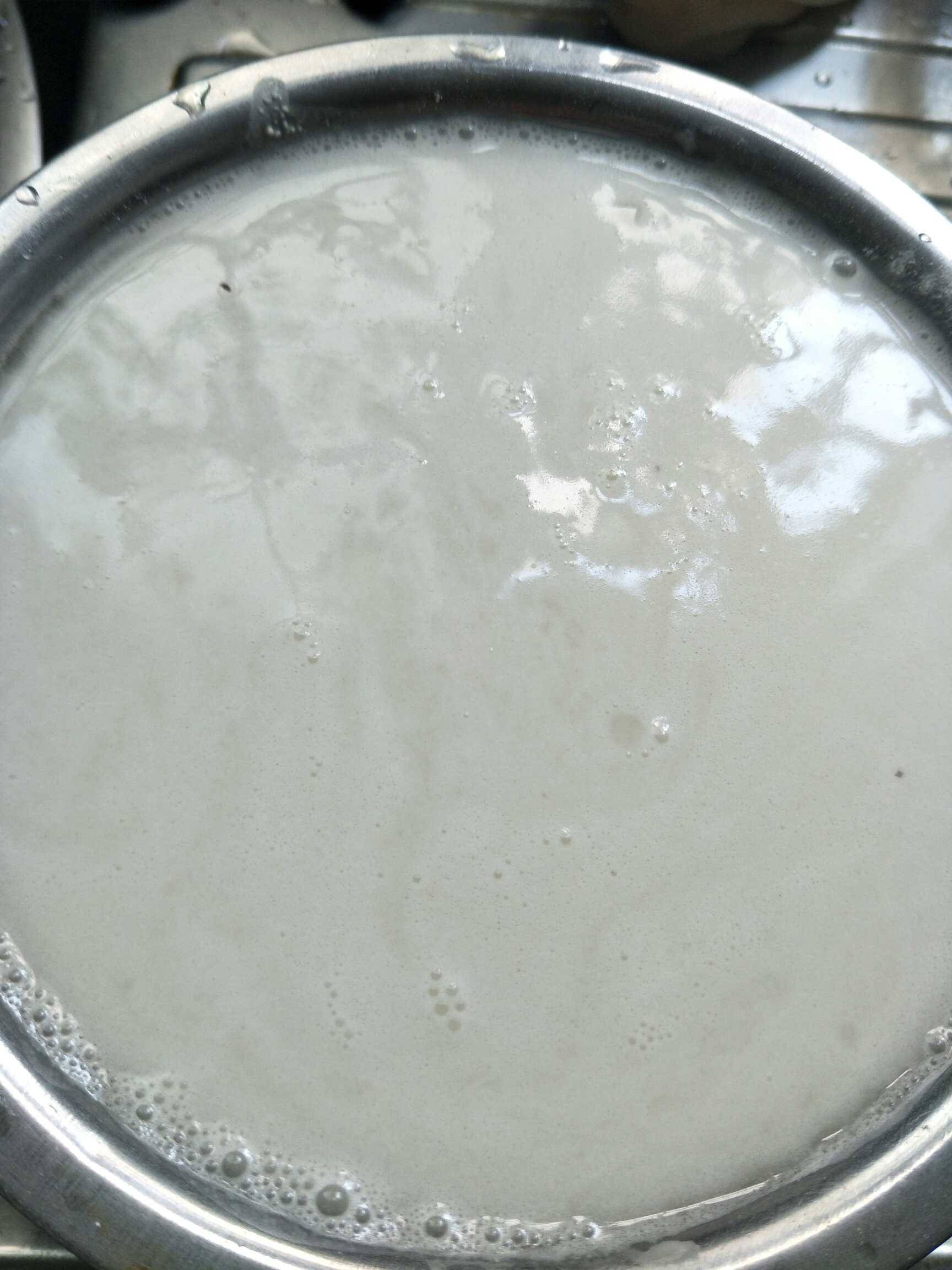 7.准备一个大盘,刷一层油,烧开水,放上盘子,放一层浆下去,盖盖子,等待2分钟!