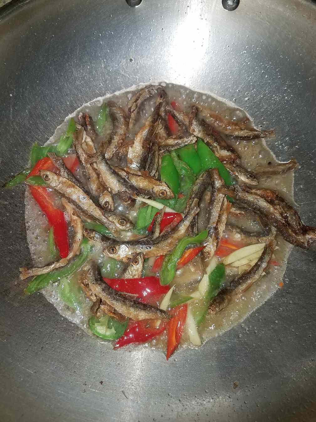 3:把鱼干也倒下去一起翻炒一分钟,加入水,盐,酱油焖焖。