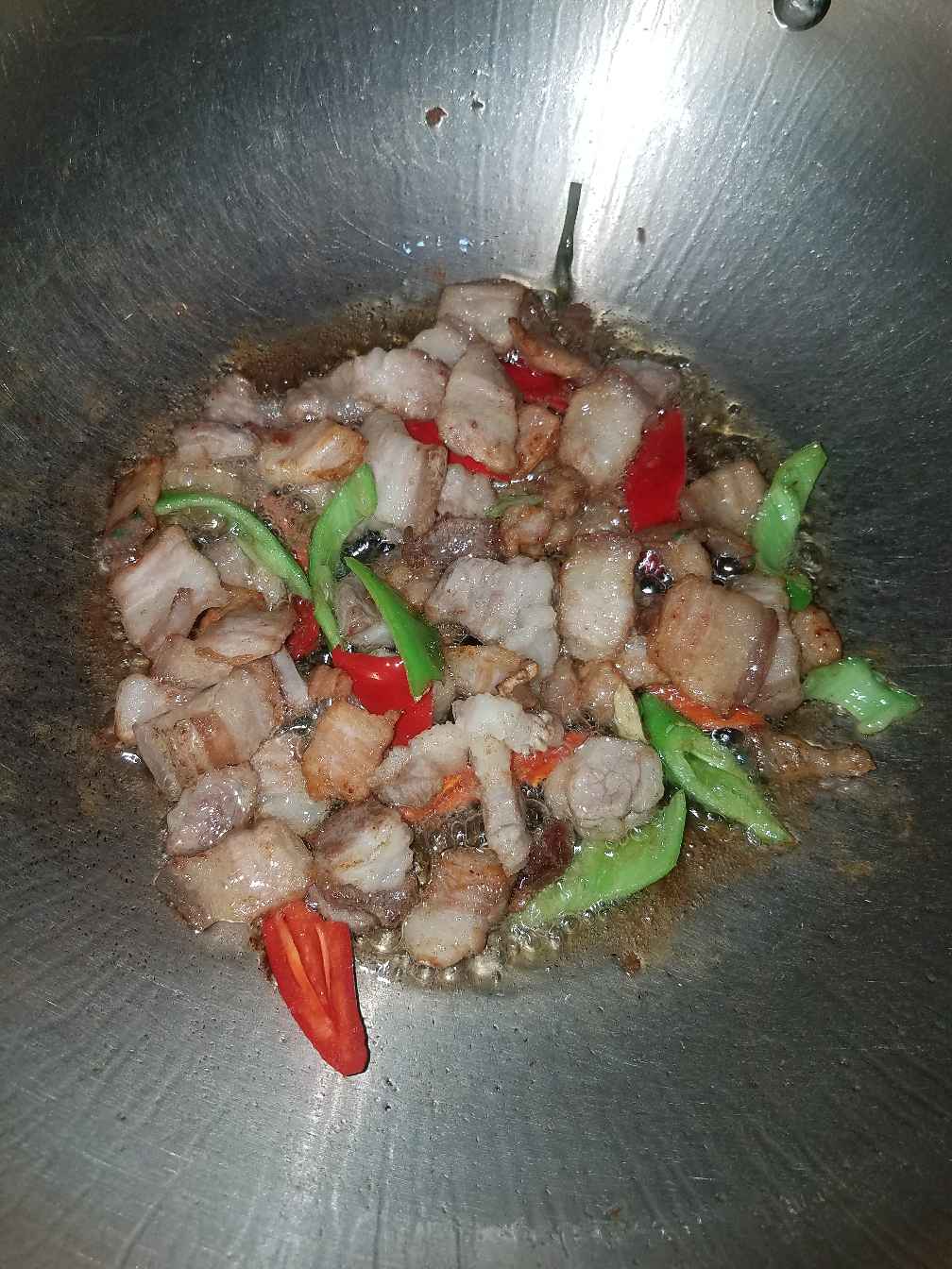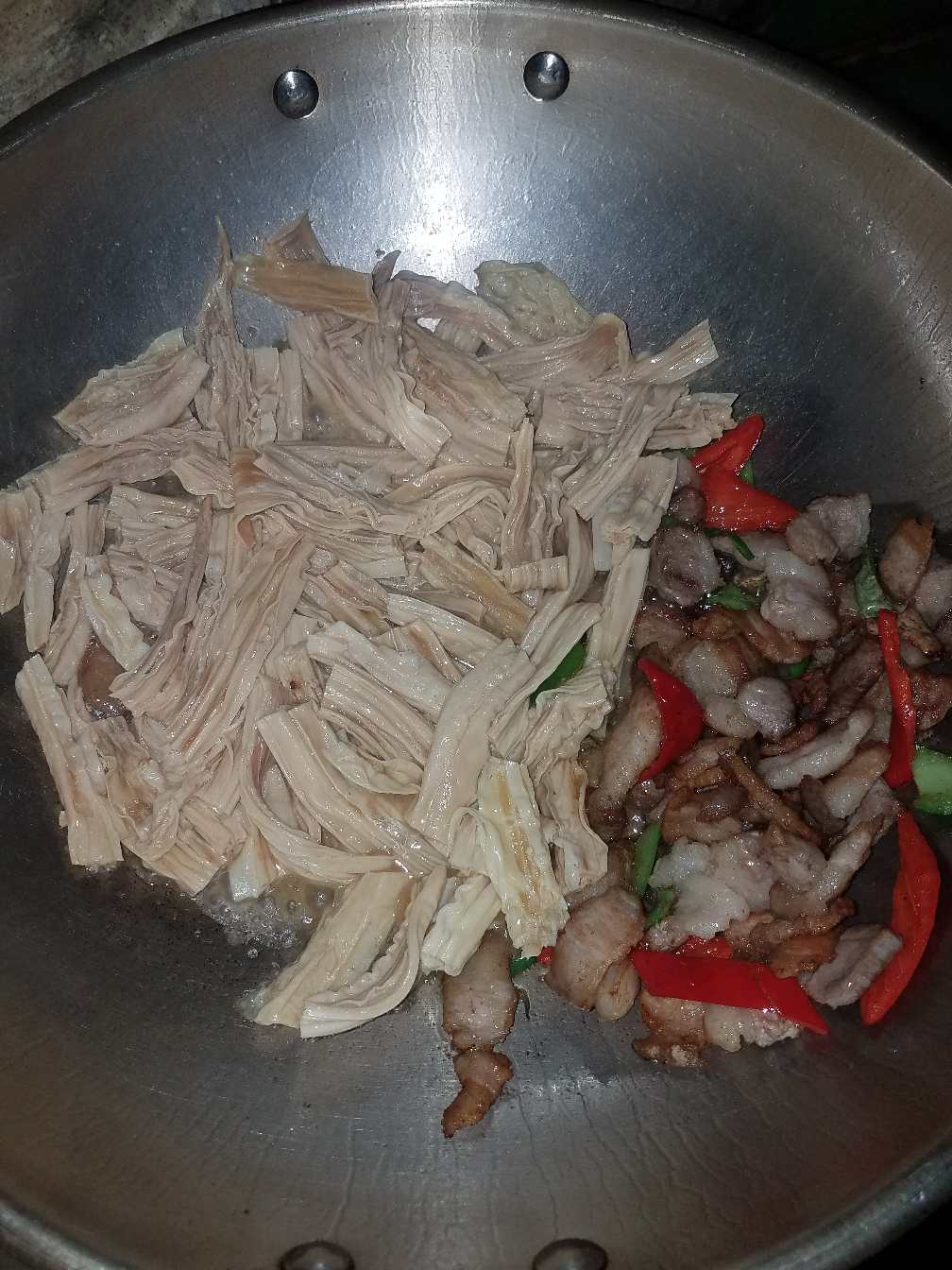 3:烧热锅,倒少许油,把带皮的五花肉先煎炸一下,到金黄色再倒入瘦的肉一起翻炒,炒上一分钟再倒入辣椒,辣椒软了,就把五花肉和辣椒隔出锅的一侧,再倒入腐竹翻炒一分钟,然后就全部合一起翻炒。