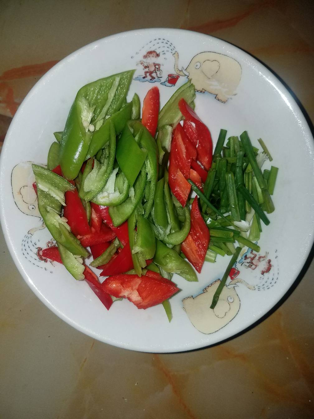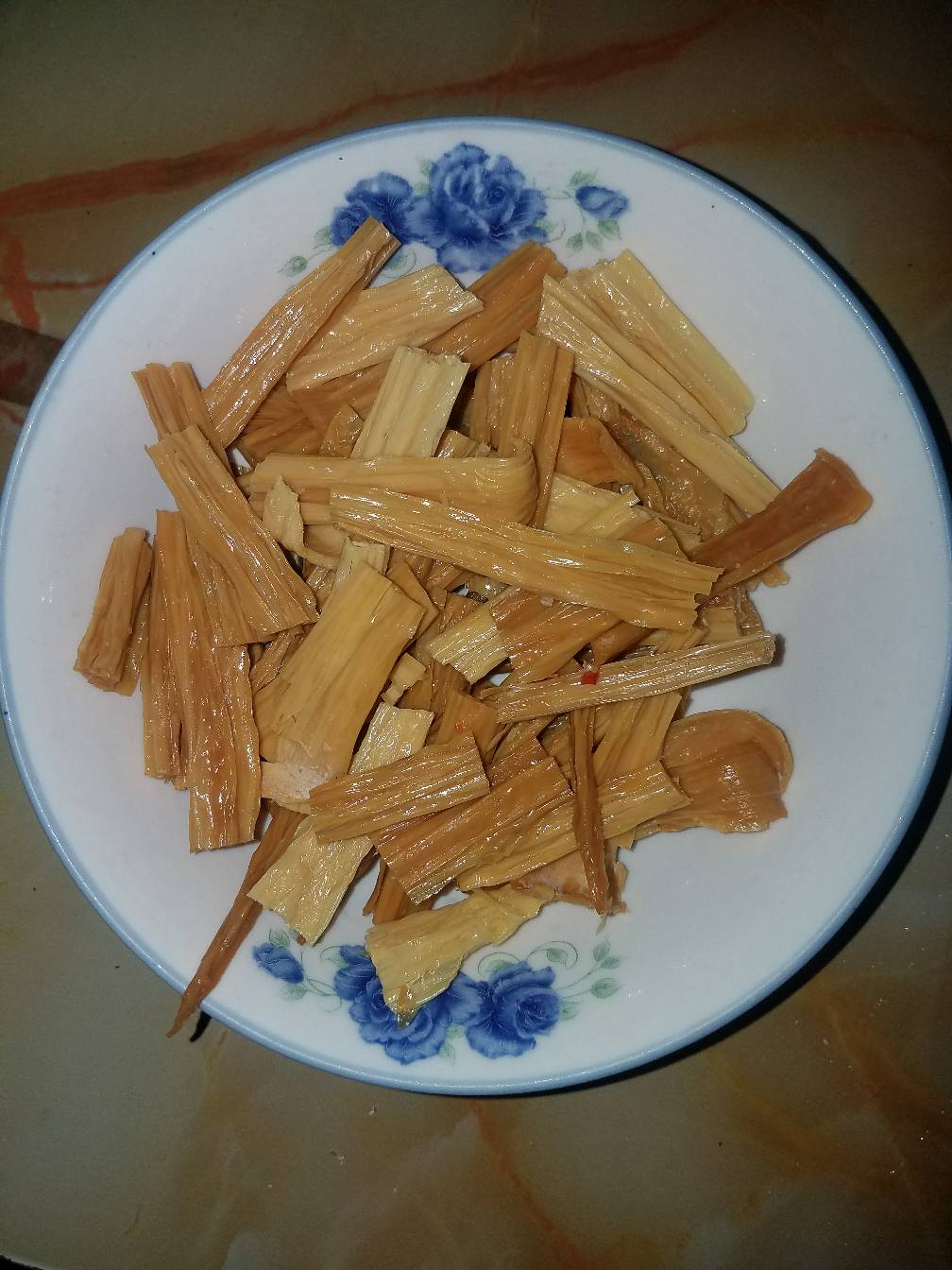 2:辣椒和葱切好,腐竹切段,锅里热水,腐竹倒下水泡软,再过冷水,装出碗里待用。