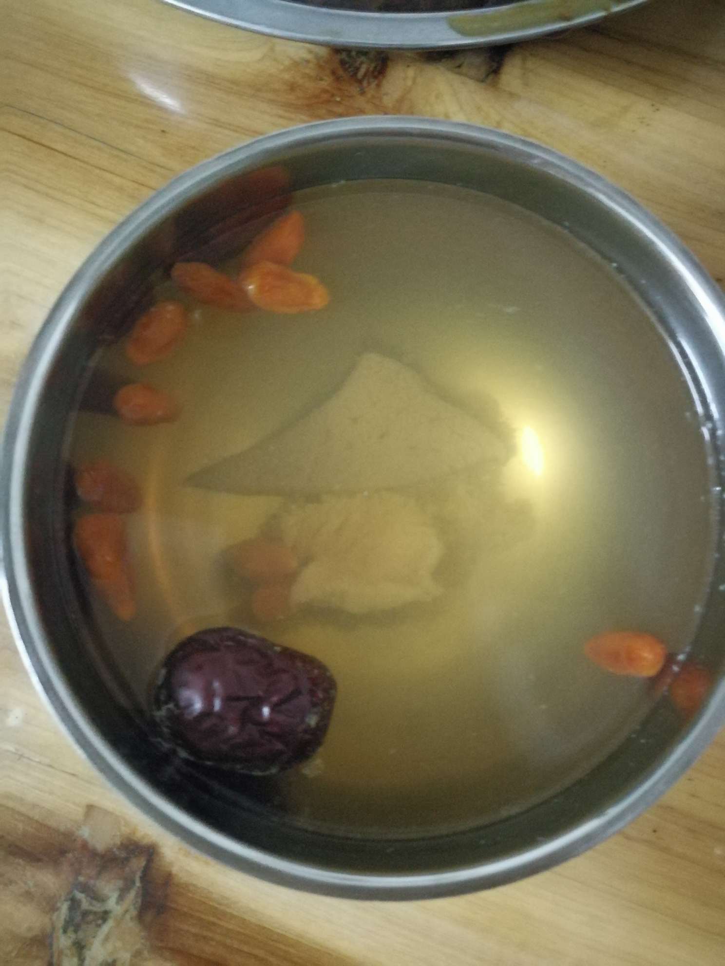 我用的分量是瘦肉猪肝各两块钱,红枣十个,枸杞一小撮,水大概6碗水,两人分量。图片只是盛好的一碗汤