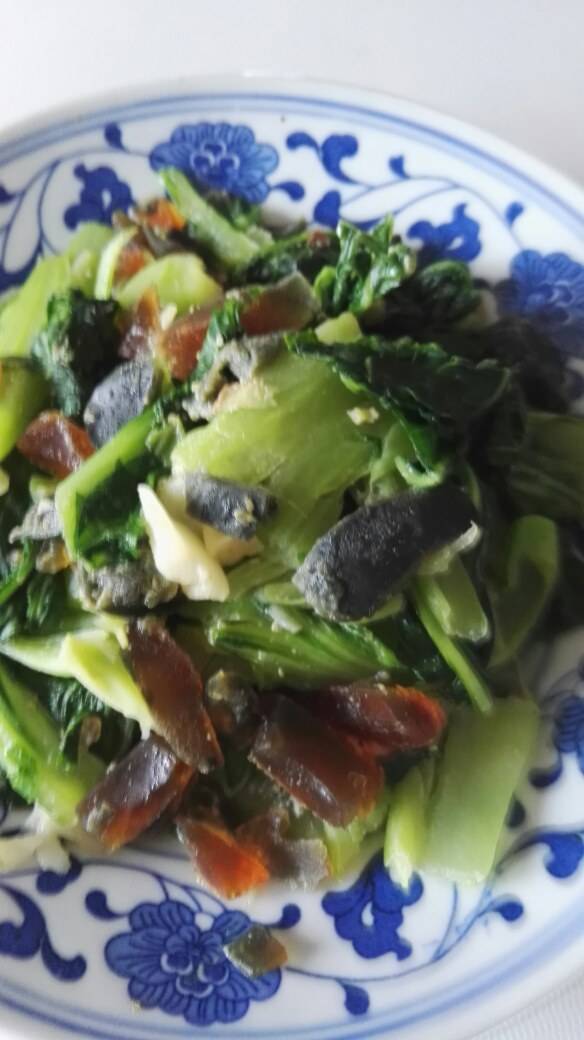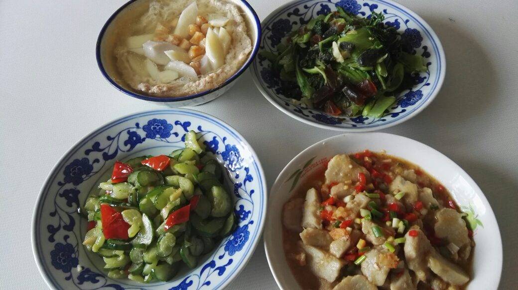 今天我那位休息,他炒的菜。有山药瑶柱肉饼汤,皮蛋芥菜,虾干烧毛芋,脆炒黄瓜