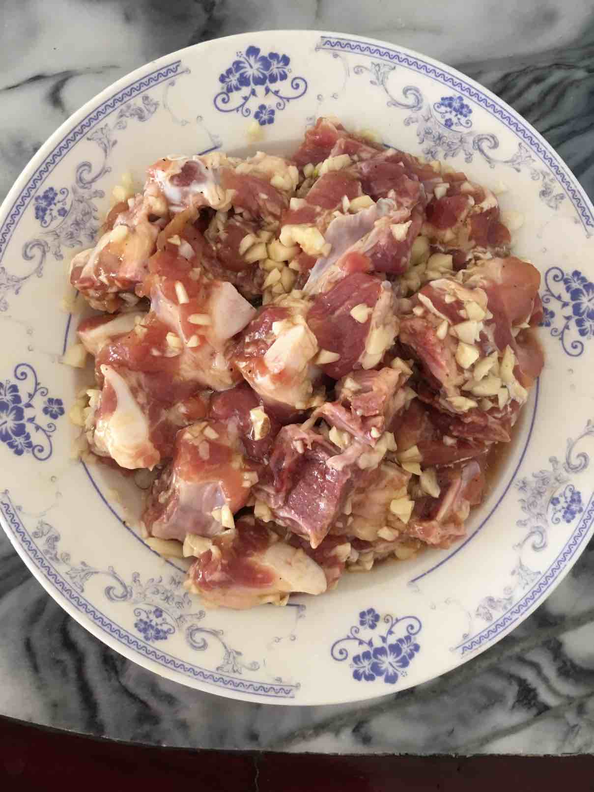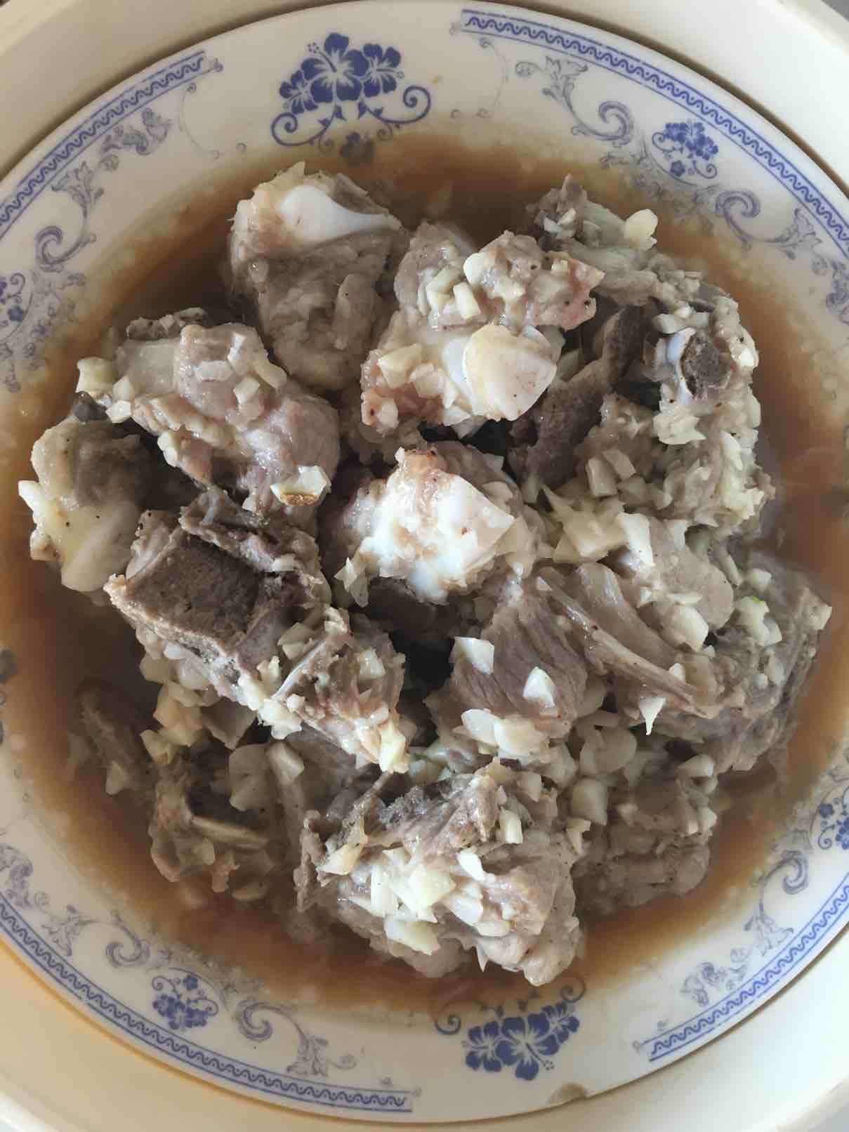 1.将排骨洗净沥干水分,大蒜切末拌上排骨再加上盐生抽生粉料酒胡椒粉,腌1小时;