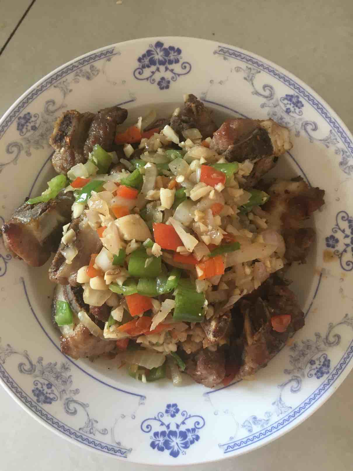 3.可以再加点料超级下饭,洋葱青椒红椒切碎炒香浇到排骨上。