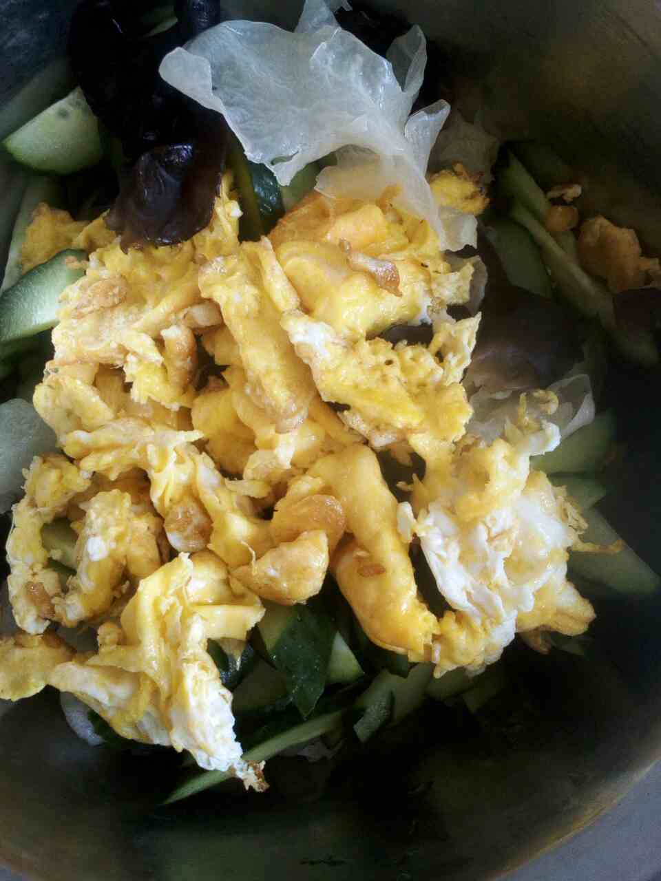 最后一个菜、这几天在家学做饭、用黑木耳银耳鸡蛋鸭蛋拌黄瓜、散养的蛋黄就是黄、看着就有营养、自从生病后就吃这种蛋了