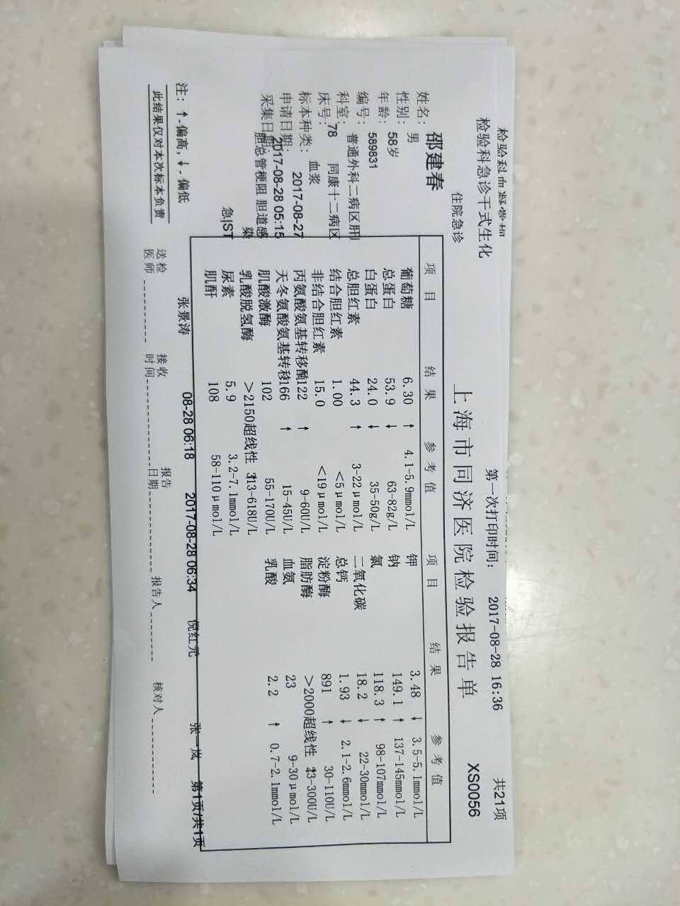 另外,我看单子,转氨酶就超了一倍,问题不大,服药后很快就好了,我家转氨酶超了快四倍,服药两周就好了。胰腺消炎也不过就一两周,大不了用最好的消炎药,只有大型三甲有。你自己要先稳住,好好和医生沟通,自己多查资料,你慌了,谁能救你父亲啊。冷静,碰见问题很正常,没到解决不了的地步。