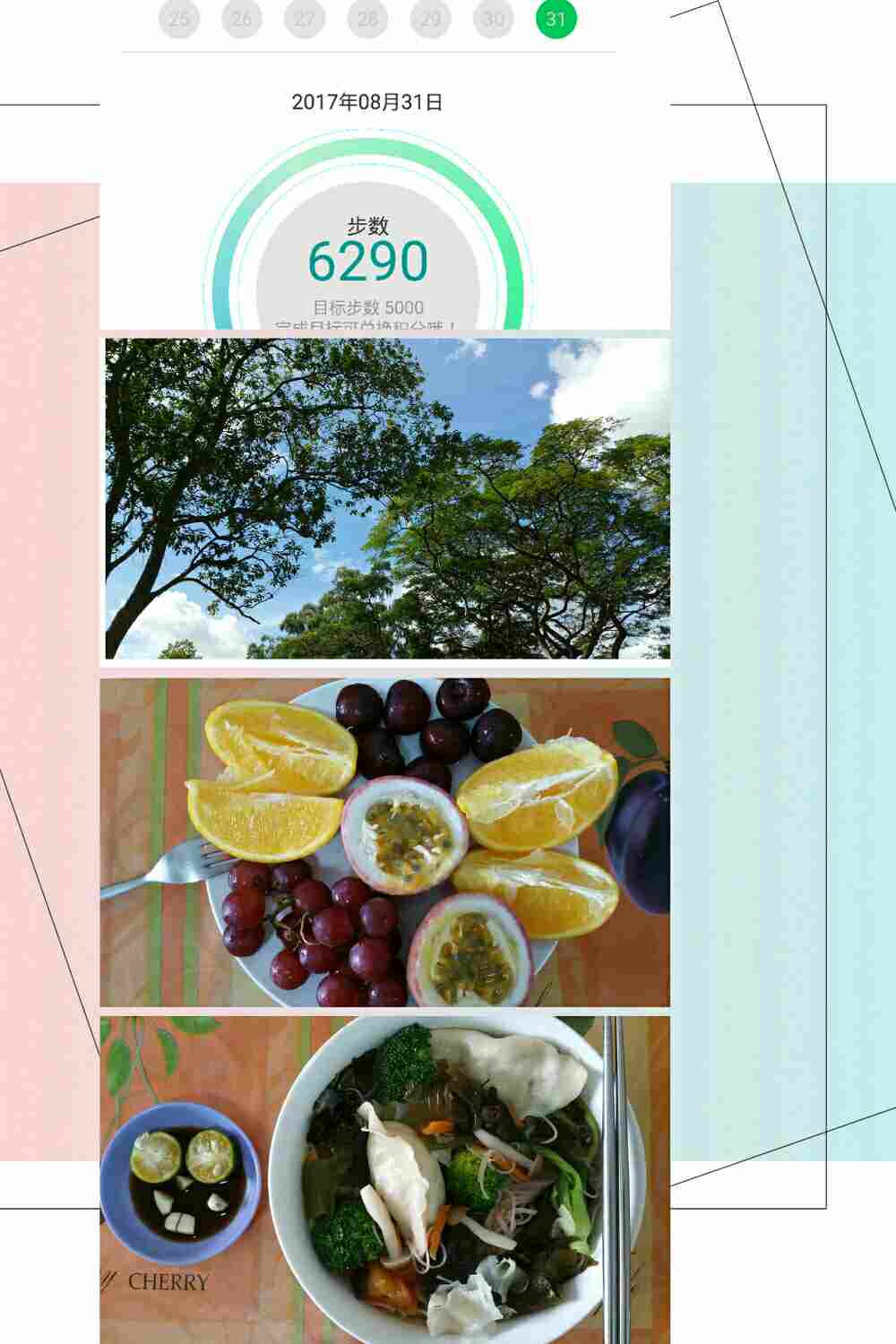 我走得不快,喜欢健步后出汗的感觉!回来后一杯温水一盘水果...今天午餐红糙米粉水饺汤:加了番茄,胡萝卜,蟹味菇,黑白木耳,西兰花,小油菜,和海菠菜;美美的一餐!😛