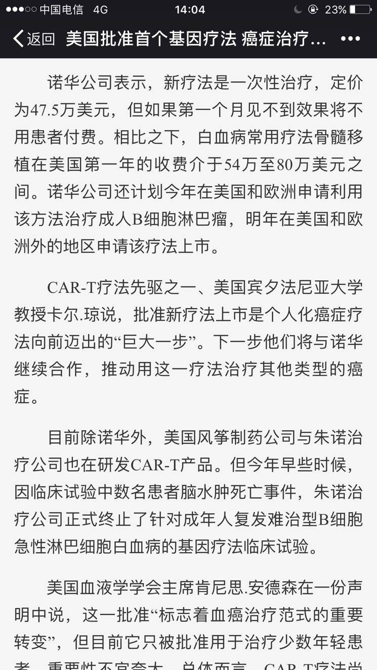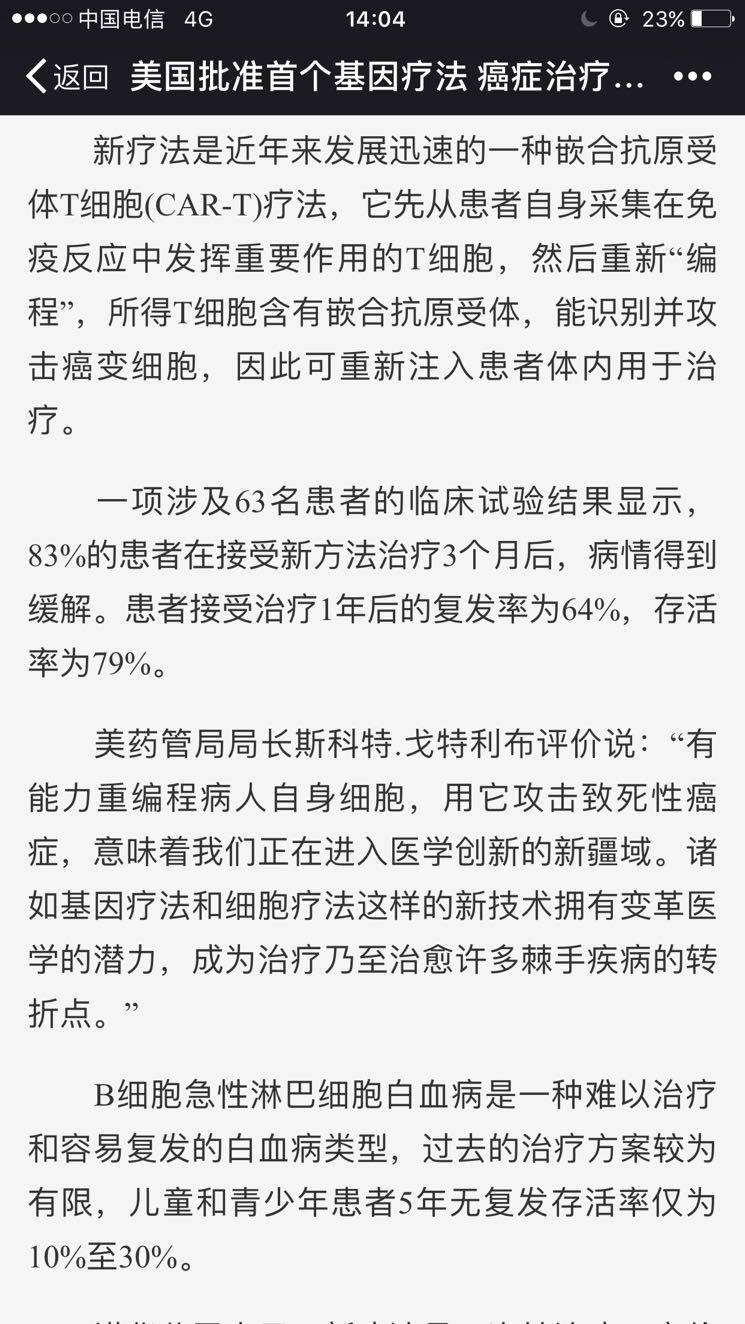 目前作用于非实体瘤,期待进一步发展,扩大病种。目前CART 免疫疗法国内是一代技术,主要是莆田系在做,大家要睁大眼睛啊,他们也要人民币三四十万的,还用在实体瘤上,大家一定要注意分辨!国外应该都是三四代技术了,目前仅用于非实体瘤,期待技术快速发展!