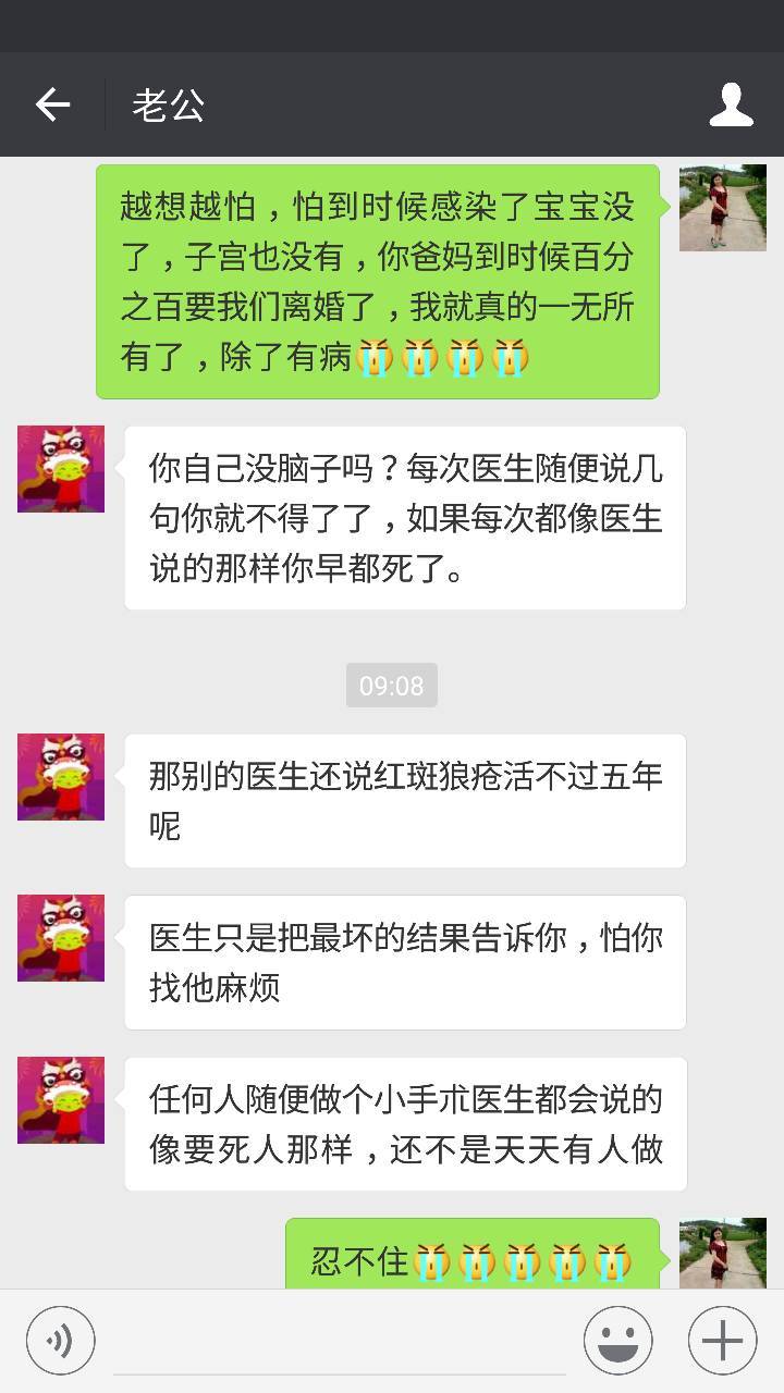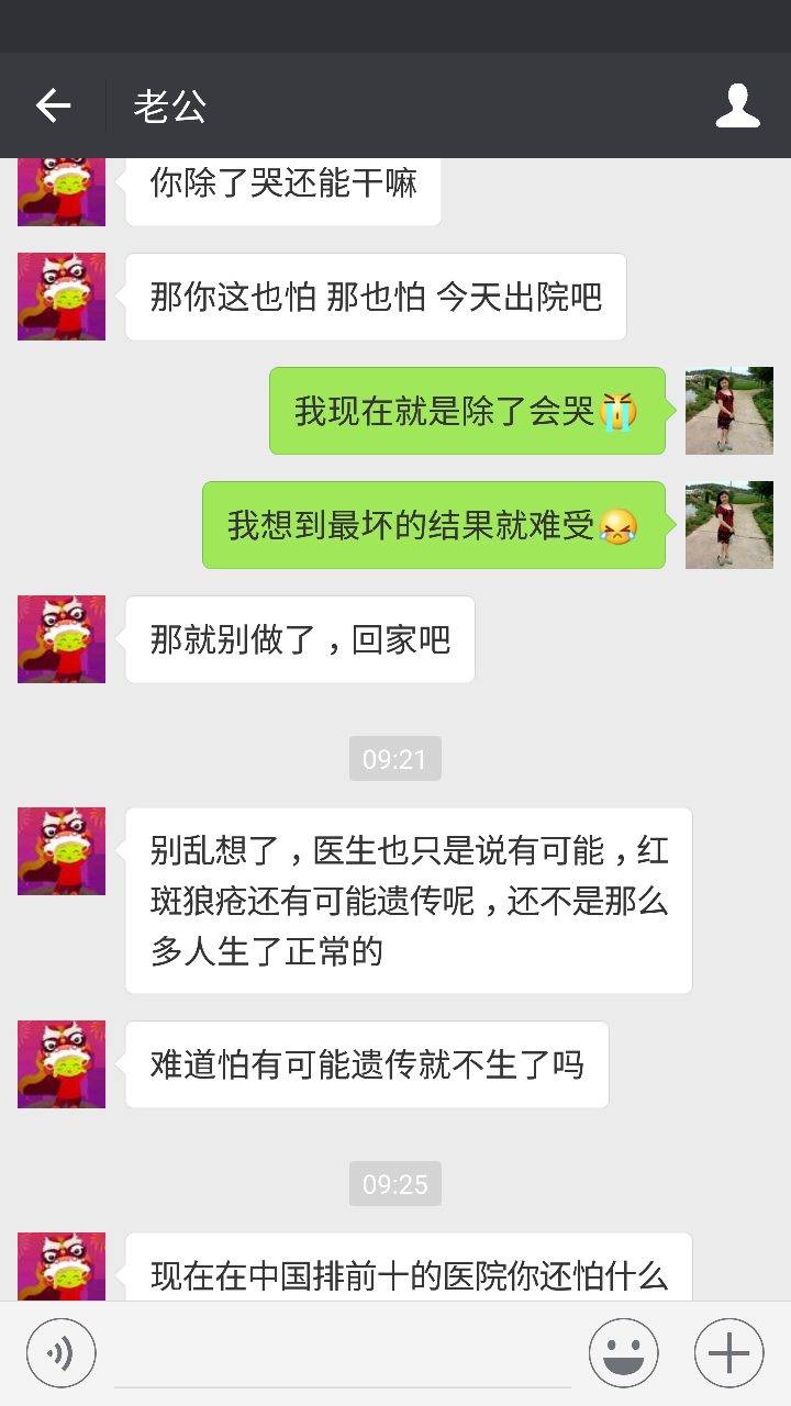 老公来了后,他告诉我们,说我做这个手术风险非常的大,主要是我有红斑狼疮,我在吃激素,对那个伤口愈合很慢,而且发生感染机率很高。说最不好的结果就是感染了,宝宝没了,更严重的话子宫也会切除掉。