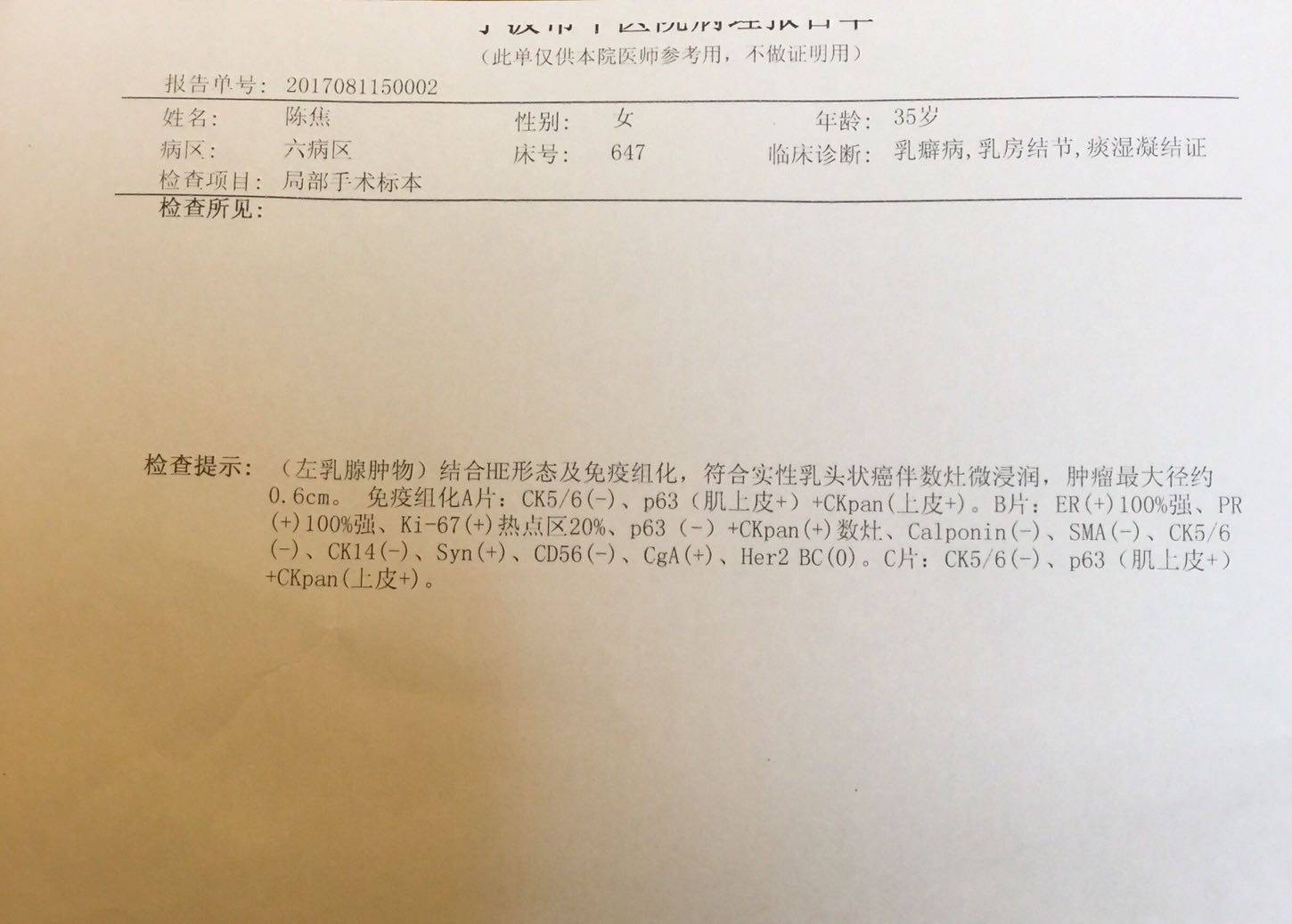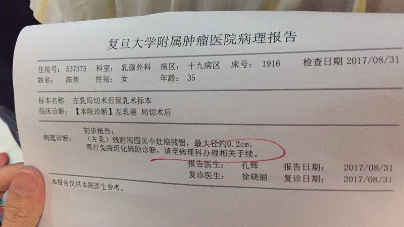 第一次手术在宁波做的,以为是良性肿瘤,术后病理发现是恶性乳头状癌伴微浸润。二次手术是8月25日在上海肿瘤医院做的扩大切除保乳手术。今天病理出来了,还要加做免疫组化,两周后才出结果。我不明白,病理上为什么没有切缘阳性阴性的判断,难道切缘也需要免疫组化来判定吗?有知道的姐妹可以帮忙回答一下吗?等得好焦急