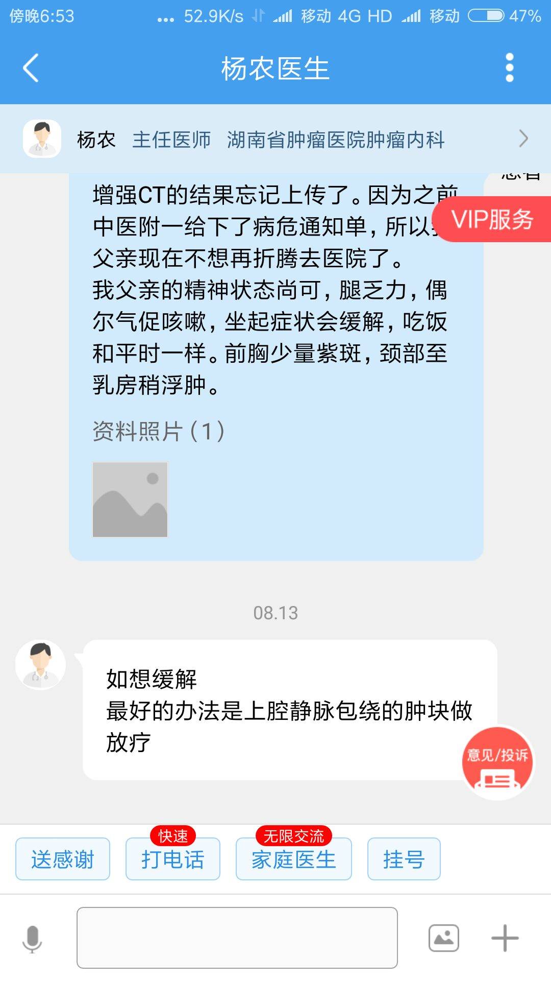 上腔静脉综合征是一组由于通过上腔静脉回流到右心房的血流部分或完全受阻相互影响所致的症候群,为肿瘤常见的急症。患者出现急性或亚急性呼吸困难和面颈肿胀。检查可见面颈、上肢和胸部淤血,水肿,进而发展为缺氧和颅内压增高,需要紧急处理。真的需要去医院处理下,要尽量劝劝,体感上看2992很有可能是有效的,现在看最要命的是这个静脉阻塞