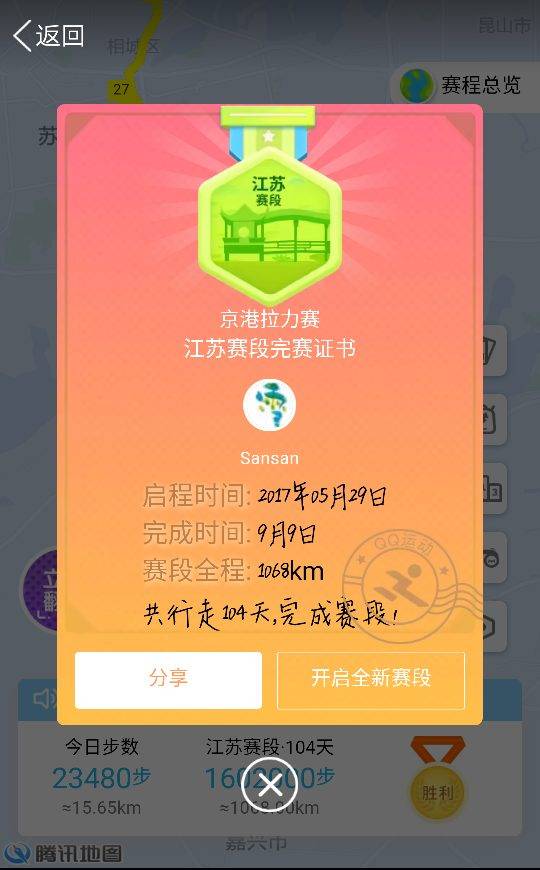 京港拉力赛江苏赛段,全长1068Km,从2017.5.29至2017.9.9日,共行走104天完成赛段,继续第四赛段,江浙沪赛段,行程起点周庄,终点三纺七巷,共1504.2Km,约2256300步,加油,给自己鼓鼓劲