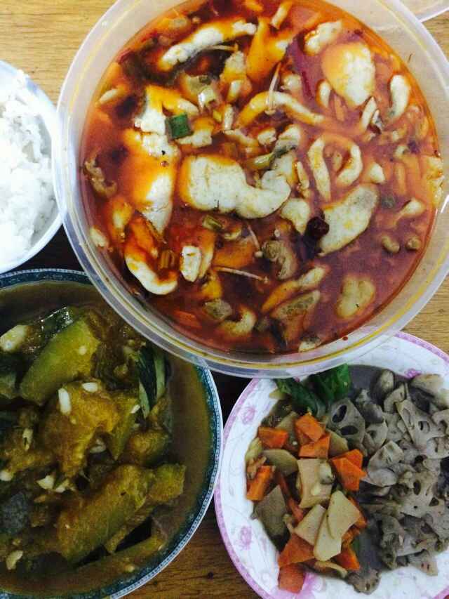 今天的晚饭,肥肠鱼,中午剩菜,南瓜
