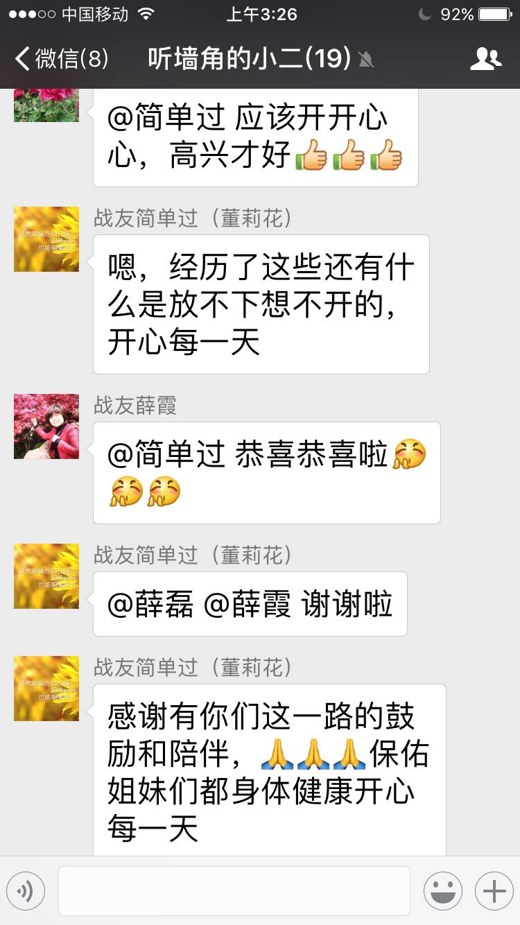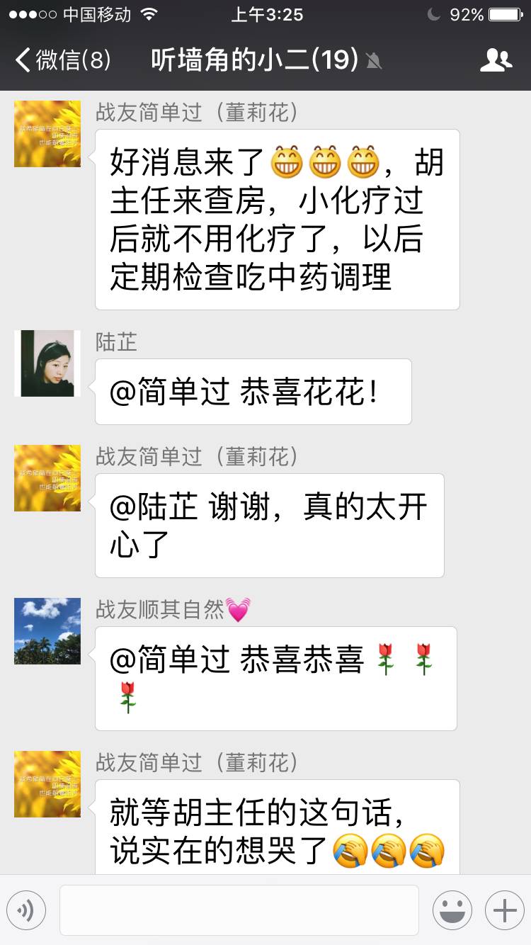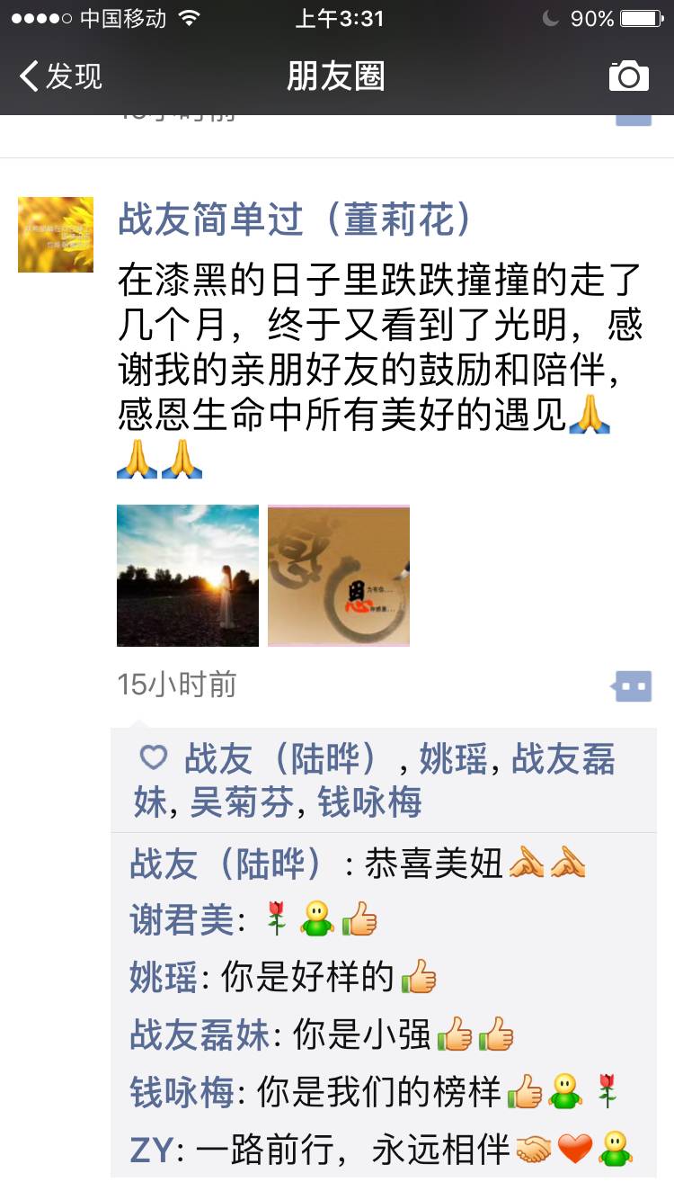 记得今年3月份我发过贴子。说我一病友术后13个月肺转移。在报告得知的第二天是姐妹们约定的春游日。为了不让姐妹们扫兴。在她的坚持下。春游照常进行。图一穿灰色衣服跳得高的那位就是她。就因为她有这样的心情和精神我们称她为:打不S的老强。春游第二天。她就奔跑上肿。在她的一路战斗下。她胜利了。请看图二三。姐妹们加油加油。你弱它强,你强它弱,我们是永远的胜利者。
