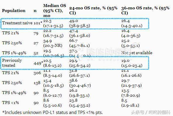 第一,PD1抑制剂治疗肺癌长期生存率指标公布了。首先是k药的数据。根据临床实验Keynote001的数据,那里面包括550名晚期肺癌患者,这也是全世界最早接受K药治疗的晚期肺癌患者。其中大多数人入组时间已经超过3年。经过细心的随访、严谨地分析,今年6月份,在美国临床肿瘤学会议上,默沙东公司首次公布了K药治疗晚期肺癌长期随访数据:101名初治的晚期肺癌(一线药物采用k药),中位总生存时间为22.3个月,其中有26.4%的患者长期生存。449名二线及二线以上的患者,中位总生存时间为10.5个月,其中19.0%的患者长期生存——汇总在一起,大约20%的患者,在接受K药治疗后,长期生存。
