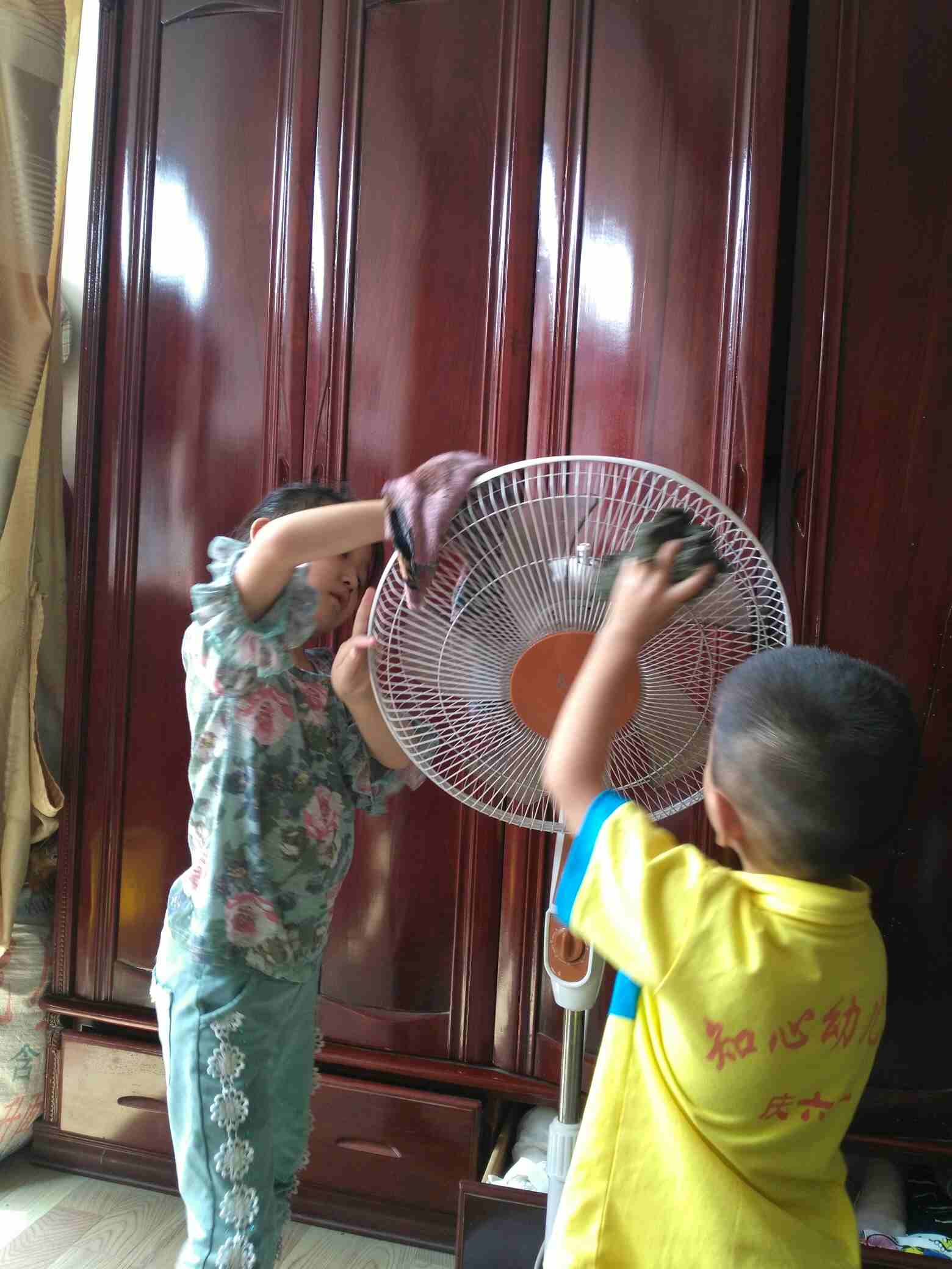 今天星期天,我洗好衣服晾上,累了躺在床上休息。俩宝贝来了,说无聊。我说帮妈妈干活好吗?孩子们很爽快的答应了,帮我擦桌子,抹凳子,我睡在床上指挥。看着她俩干活,心里满满的感动,我虽然骨坏了有时会疼,每天都很累,但很快乐也很幸福,希望永远这么幸福下去,孩子们一直这么听话……看着你们慢慢长大……有我的一直陪伴足矣,妈妈永远爱你们!