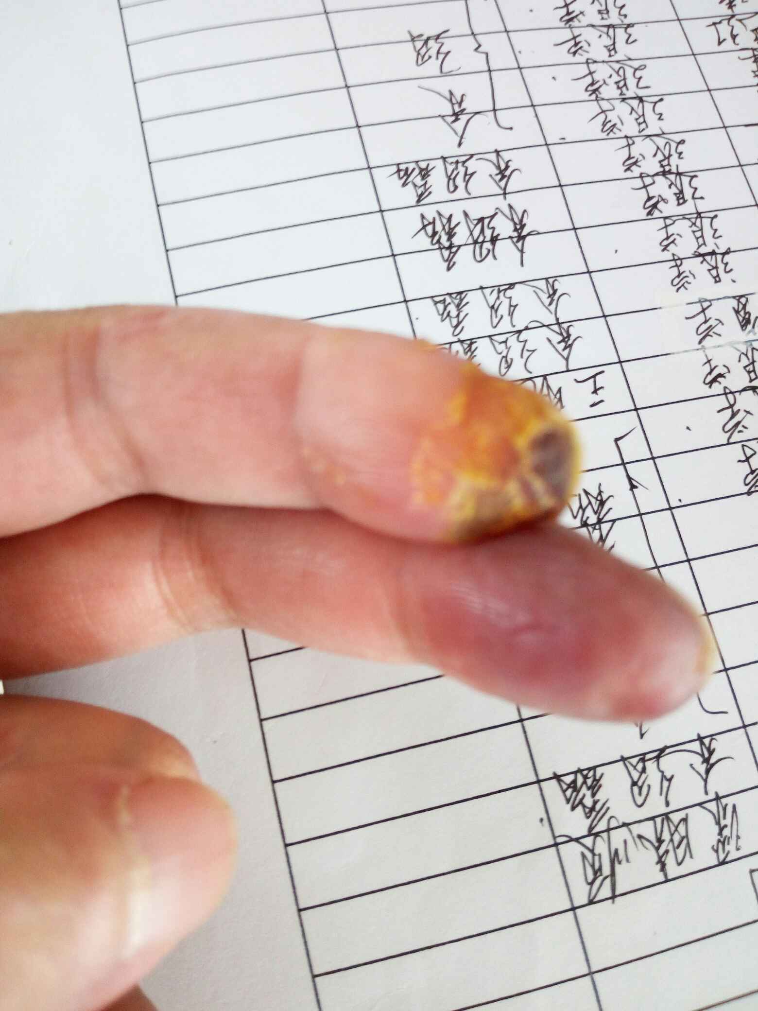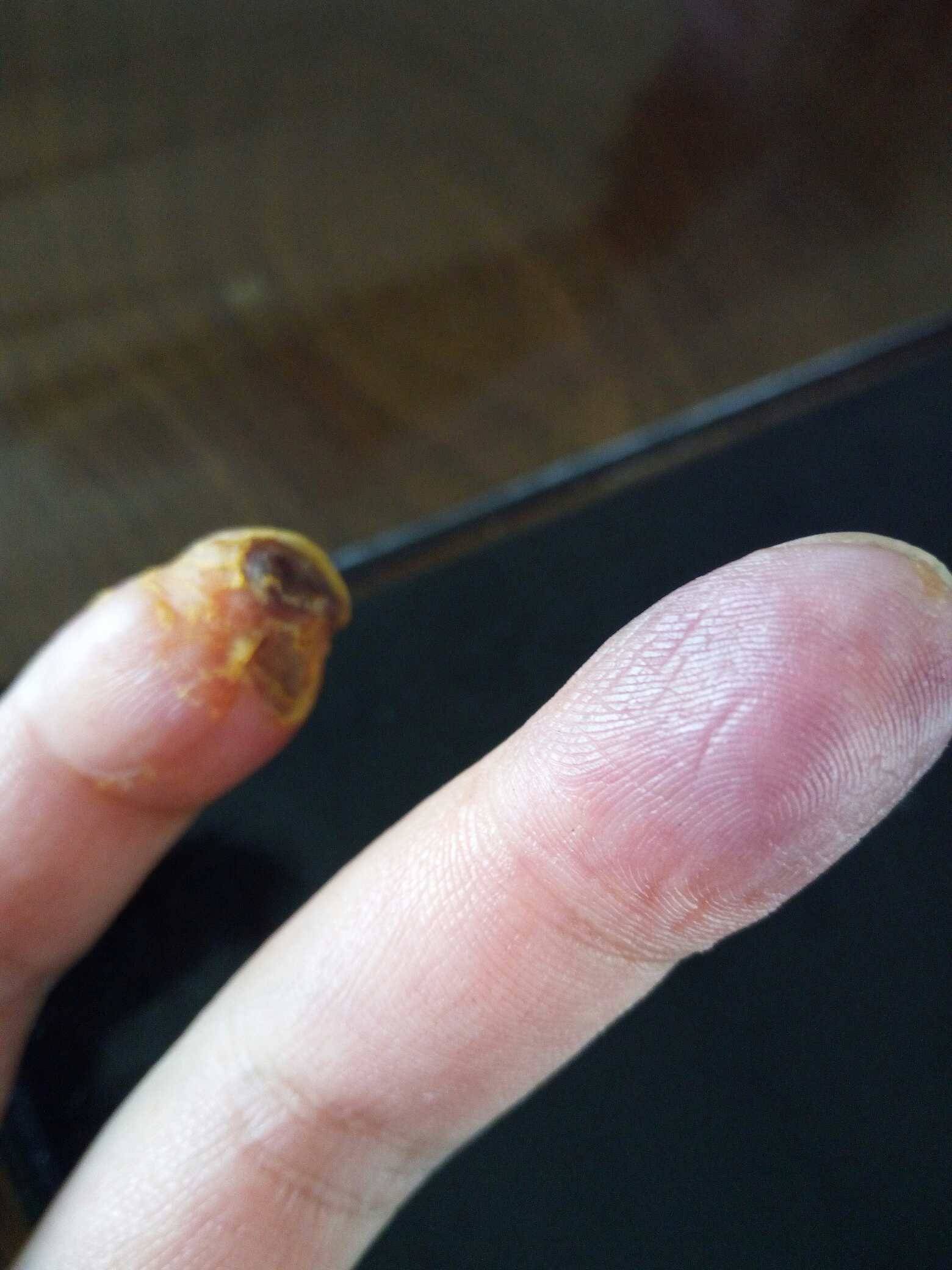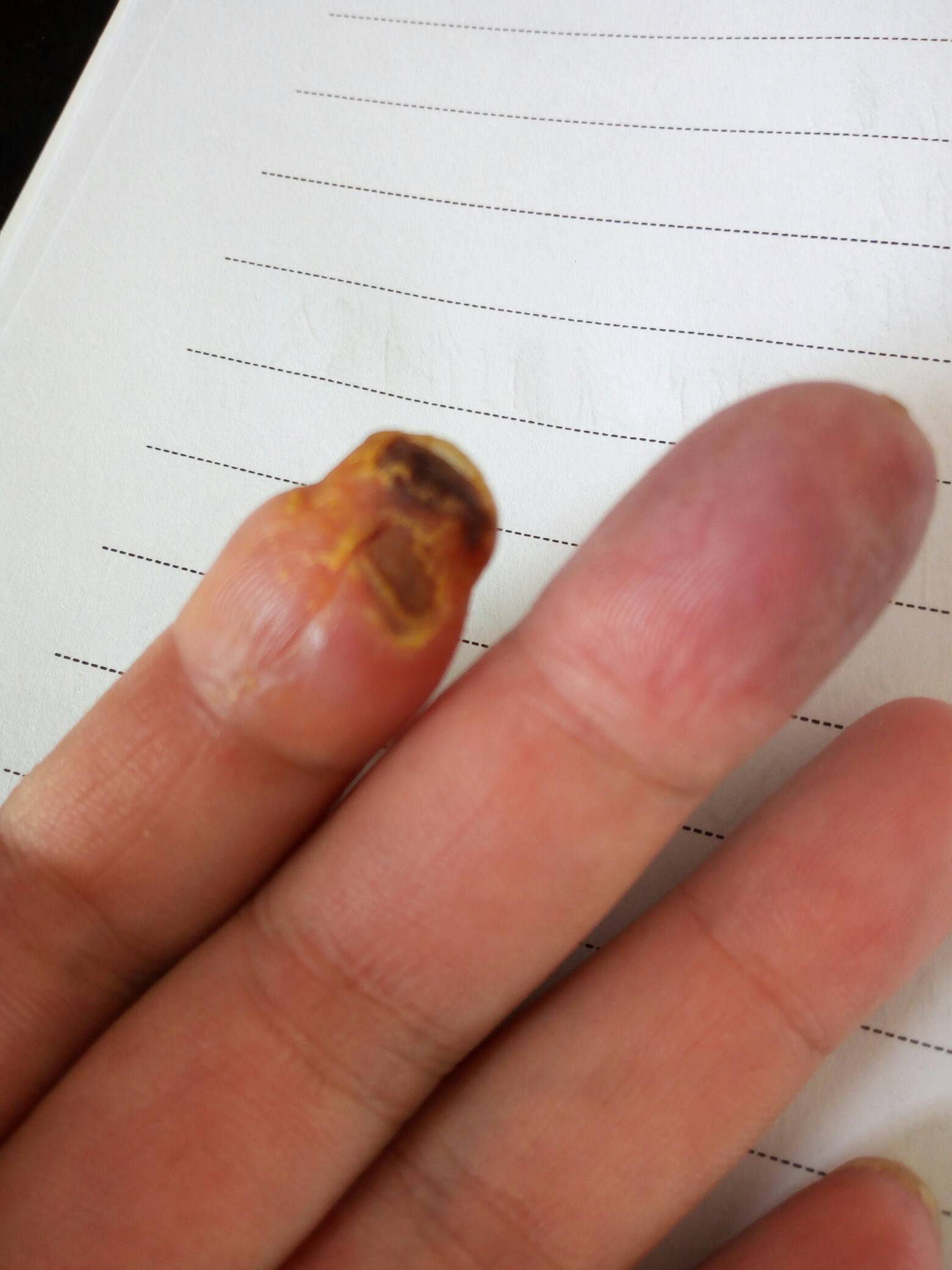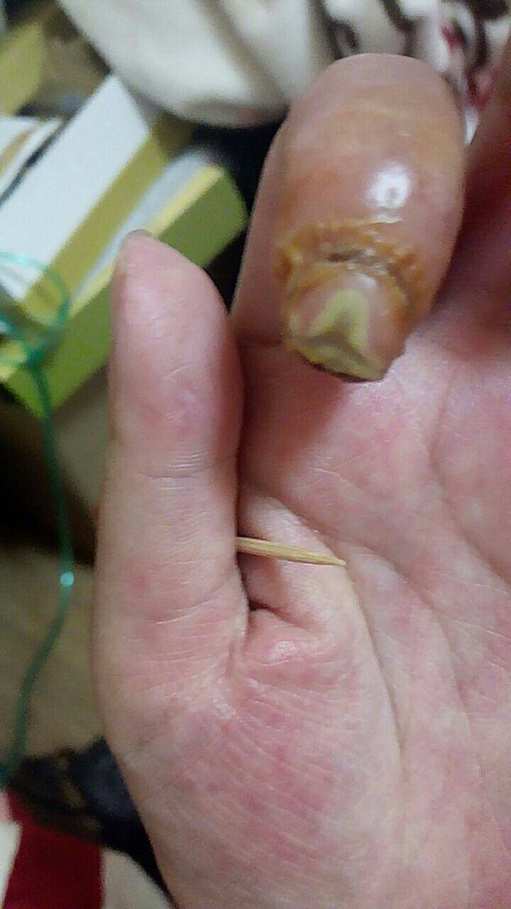 26号周六去医院看,医生给打了一次环磷酰胺,说是让我周一的住院,心里想着自己好好注意一下应该不会太坏,于是回去上班了!这是我最错误的决定,回去后更严重了,指尖开始破皮流血,指甲坏死,疼痛更甚,才开学,被安排了去培训,疼也疼了,那就培训回来再说,上周开始,更可怕的又发生了,这个还没好,中指又开始疼了!